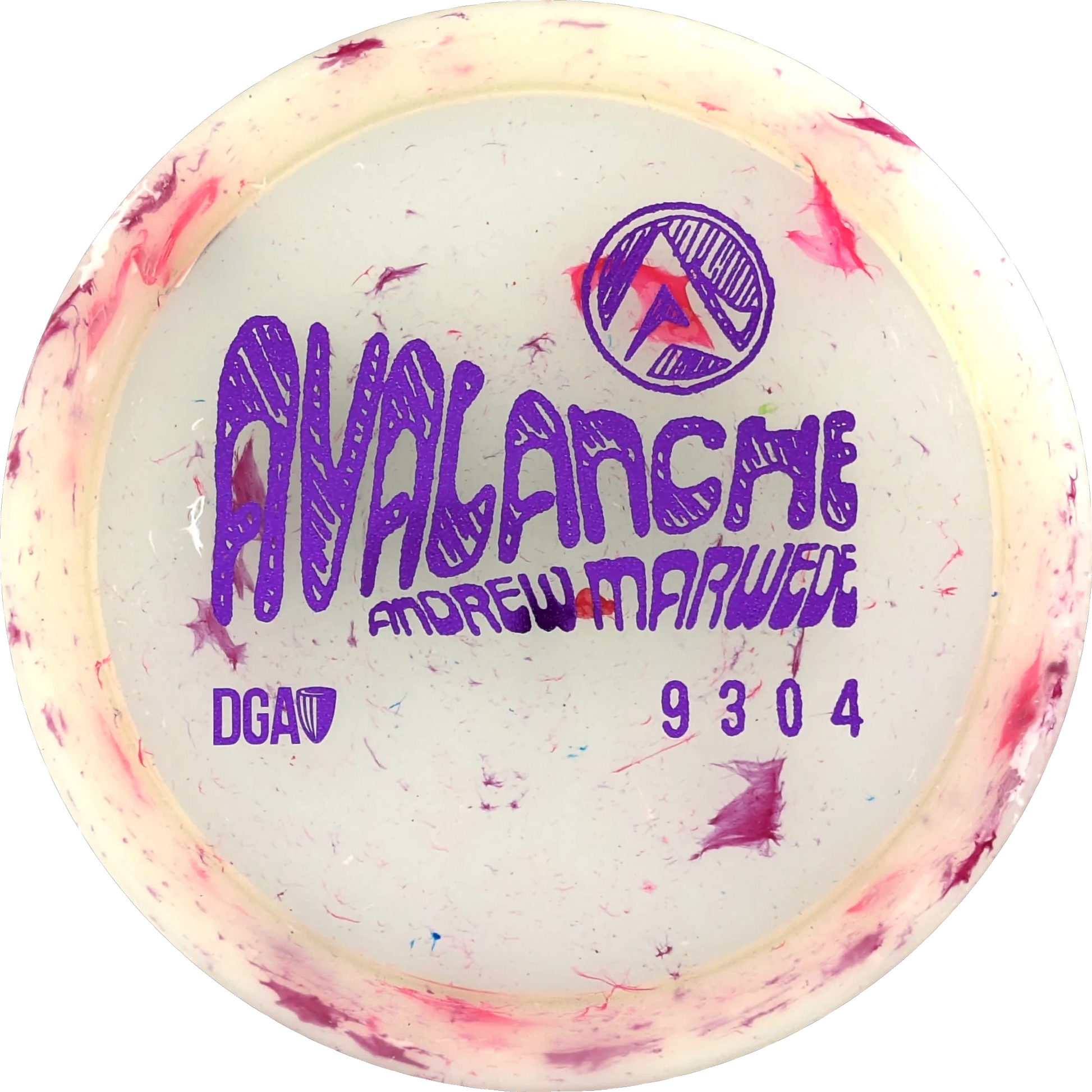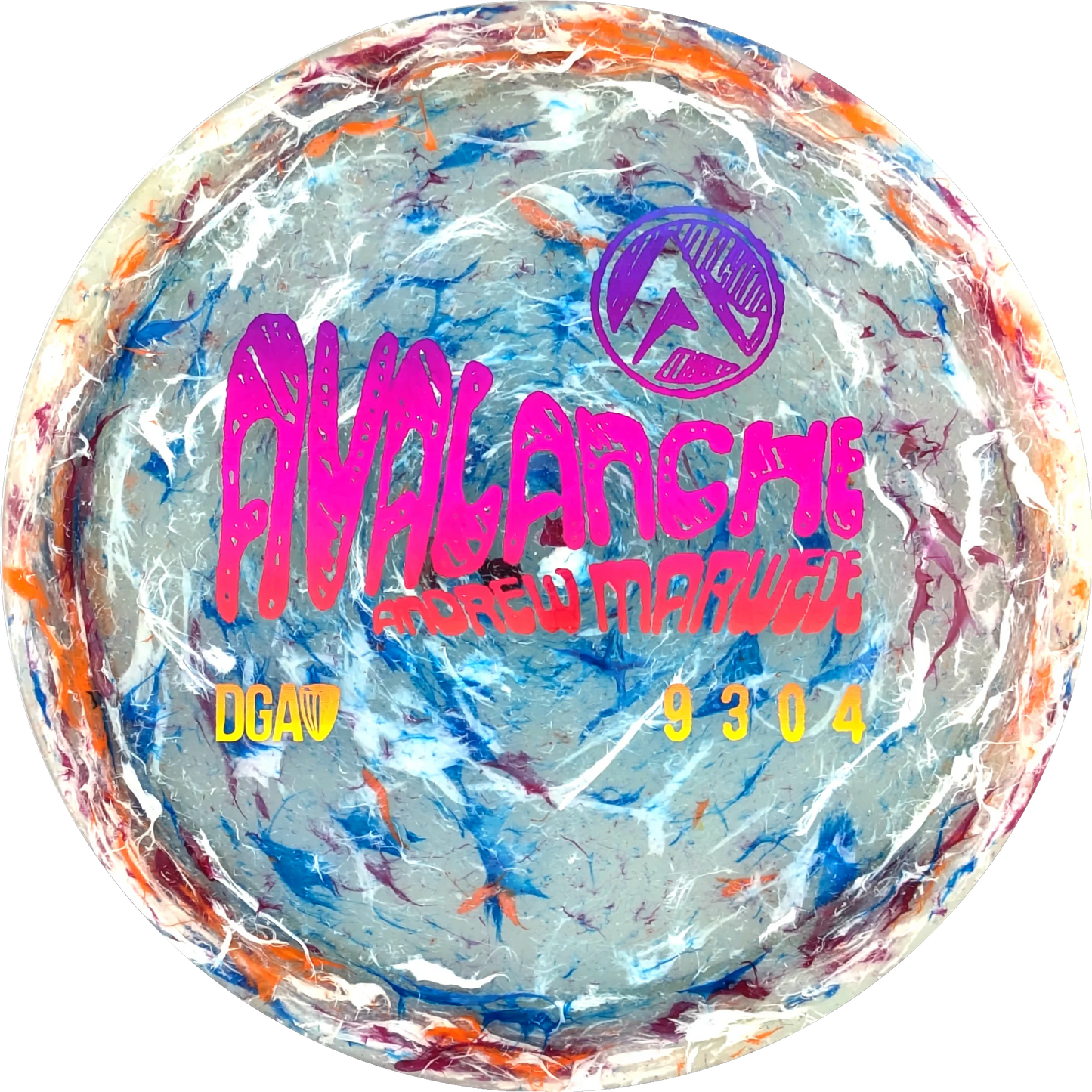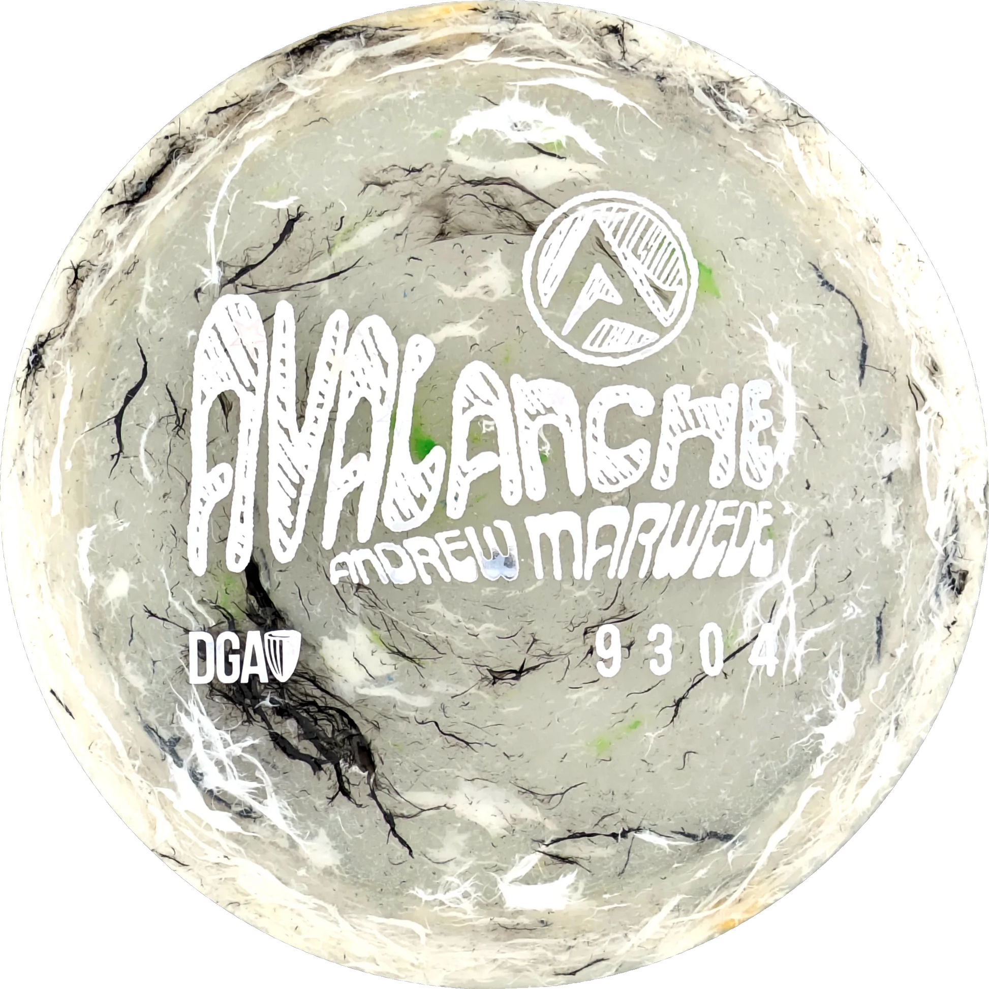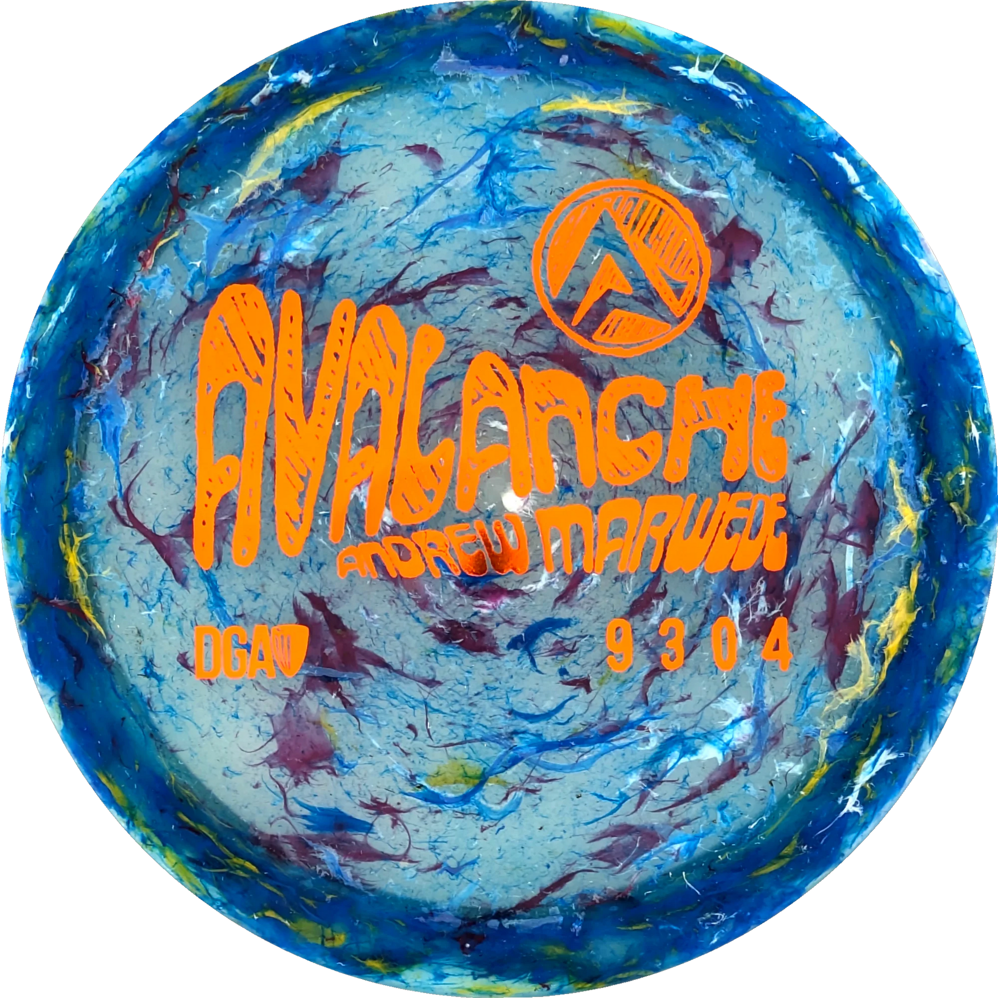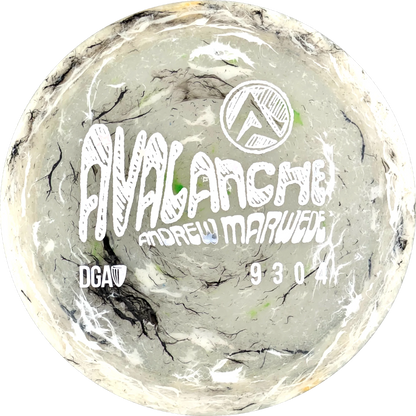 The Avalanche is an ultra-stable fairway driver, built for sure-footed lines, controlled throws in the wind and powerful drives. This version of the Avalanche is part of the DGA 2025 Tour Series for Andrew Marwede and is made from the new Granite plastic, which combines colorful marble patterns with a perfect balance of grip and flexibility. With low glide and a pronounced fade, the Avalanche provides security on both drives and approaches. An obvious choice for players looking for maximum stability and control.