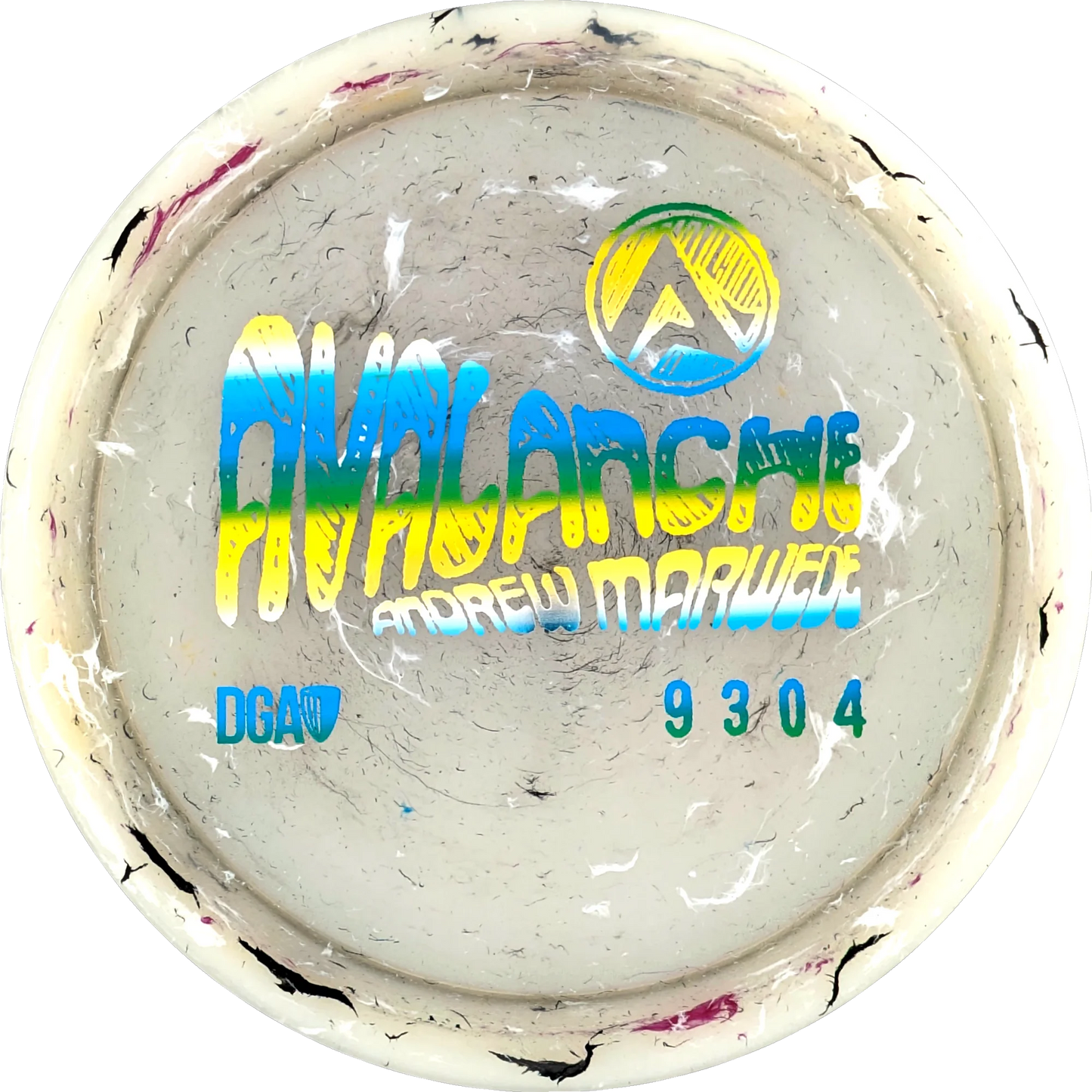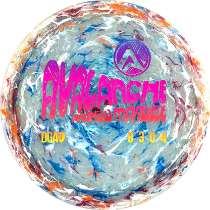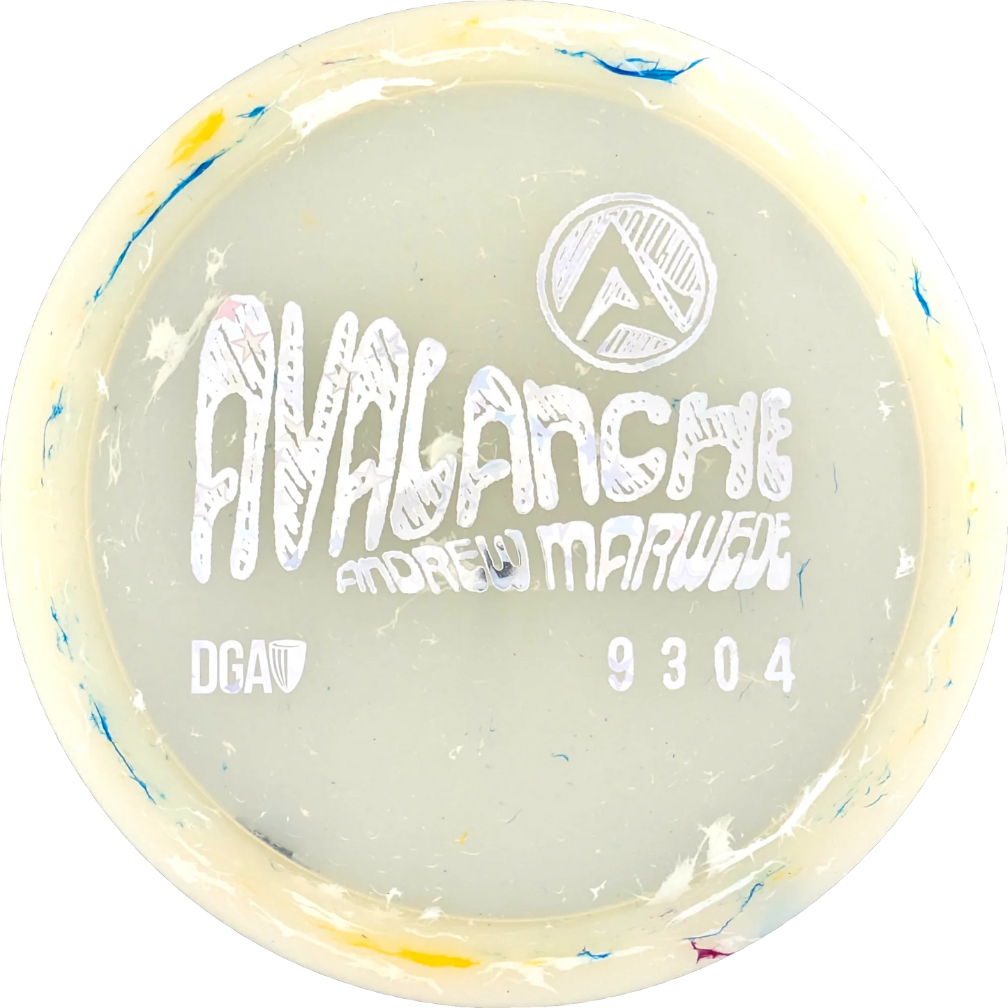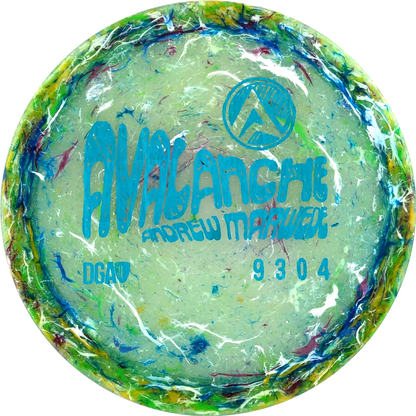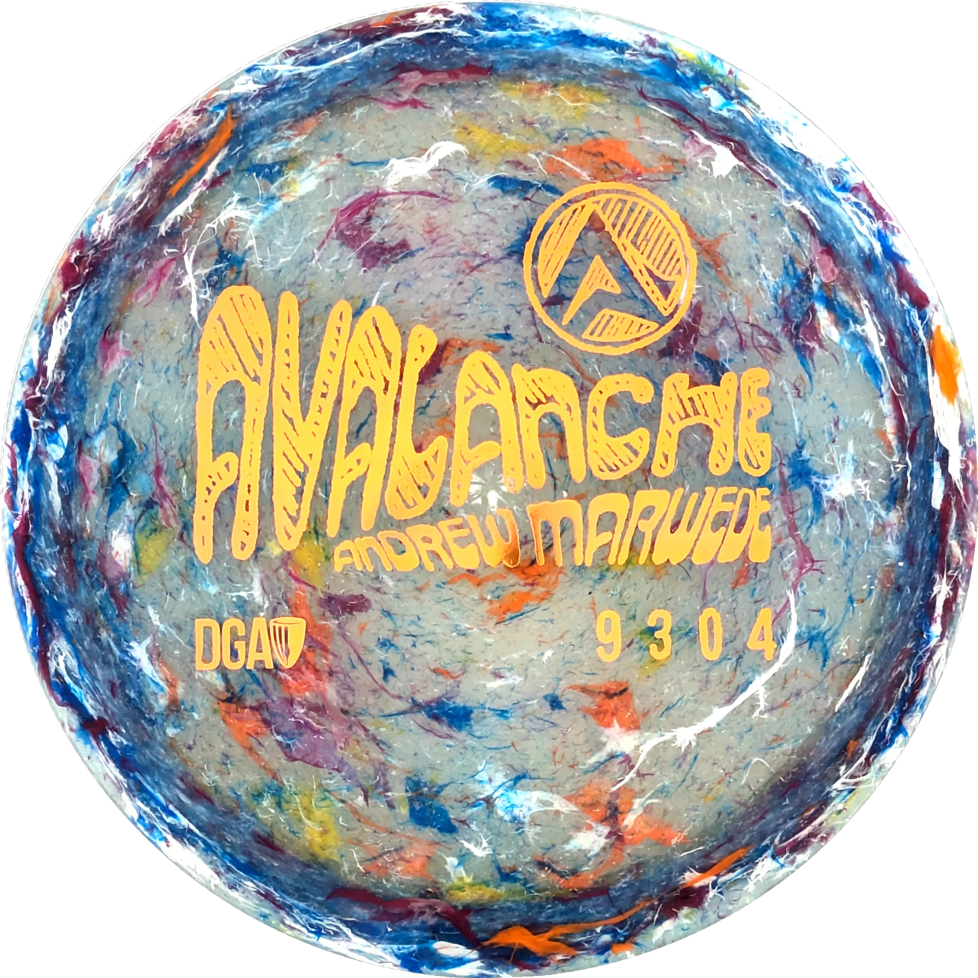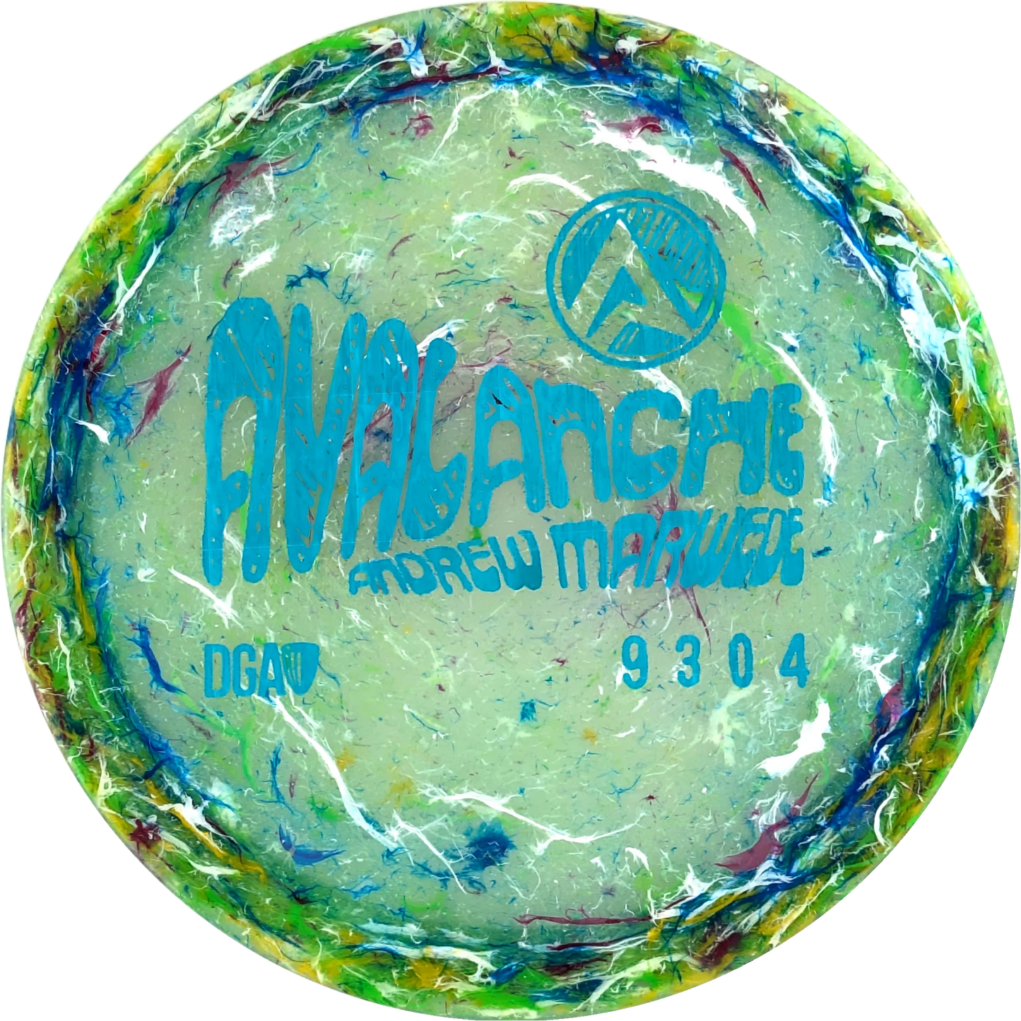 The Avalanche is an ultra-stable fairway driver, built for sure-footed lines, controlled throws in the wind and powerful drives. This version of the Avalanche is part of the DGA 2025 Tour Series for Andrew Marwede and is made from the new Granite plastic, which combines colorful marble patterns with a perfect balance of grip and flexibility. With low glide and a pronounced fade, the Avalanche provides security on both drives and approaches. An obvious choice for players looking for maximum stability and control.