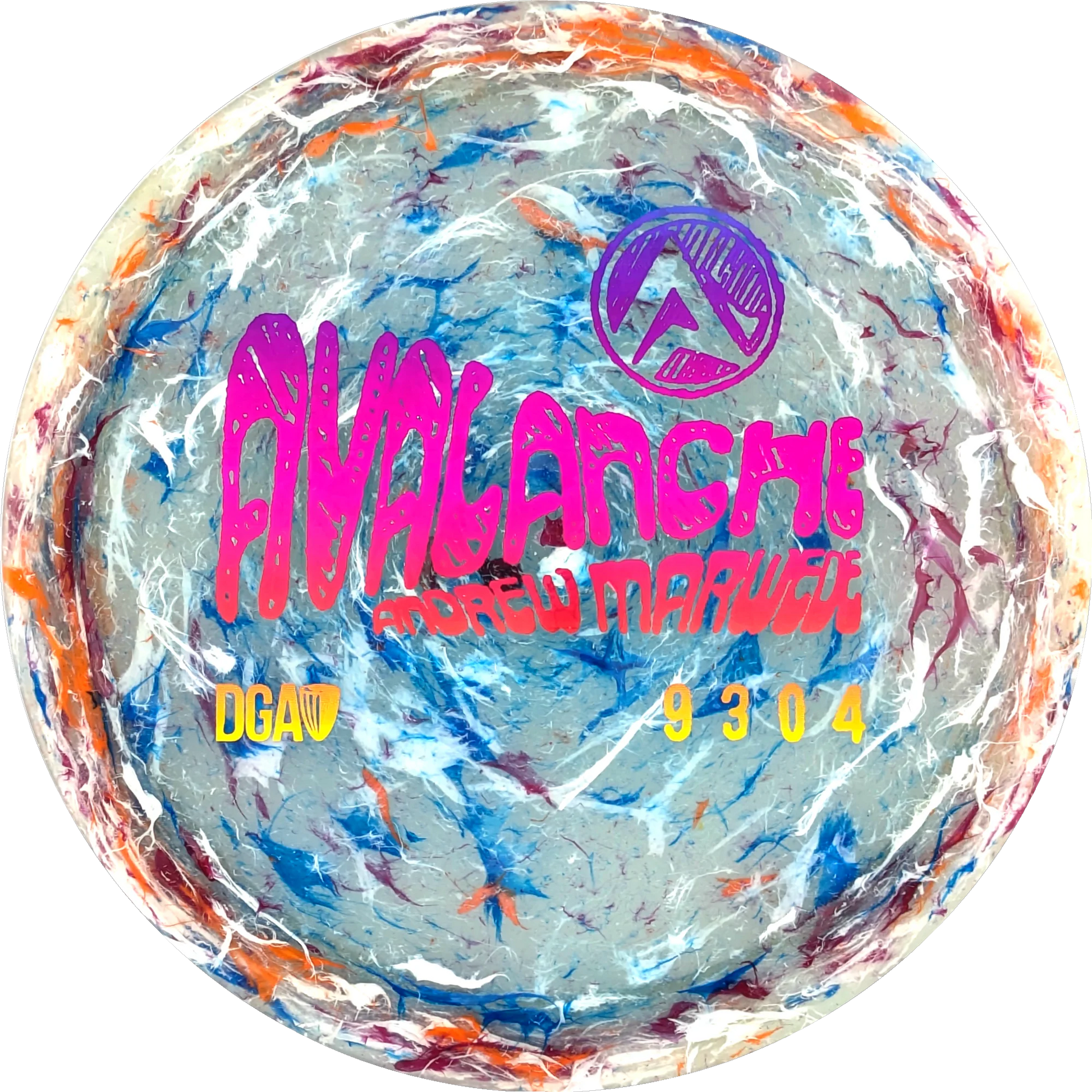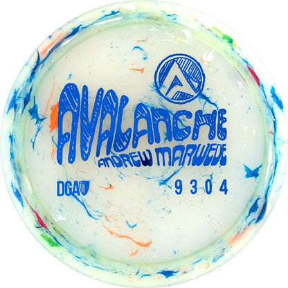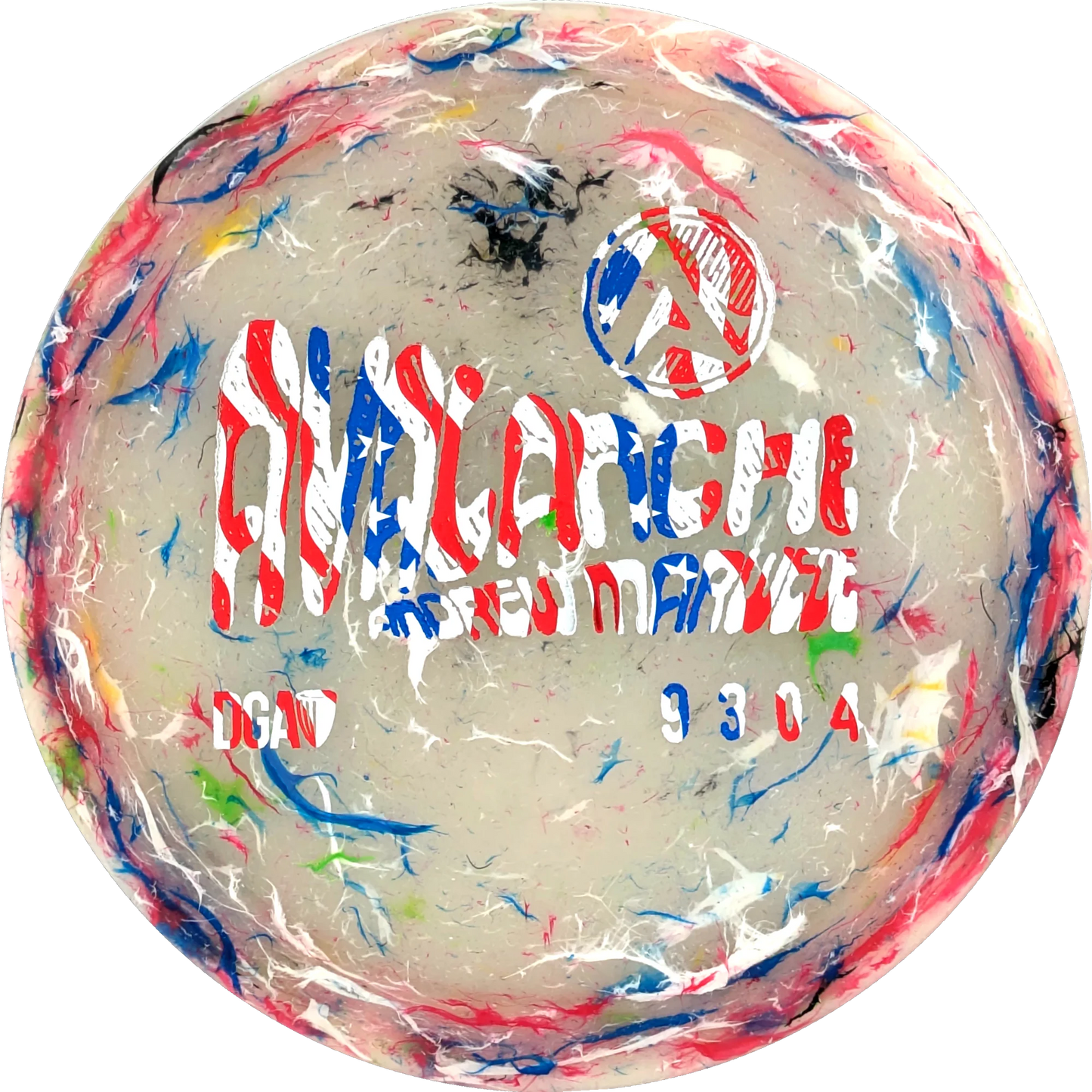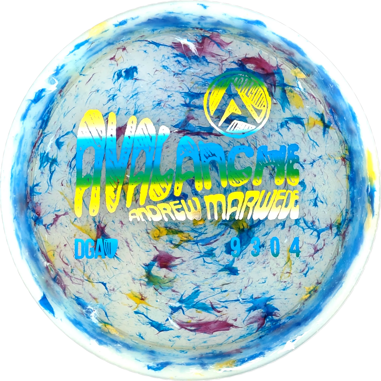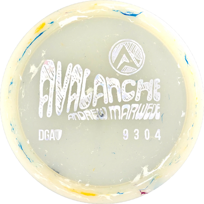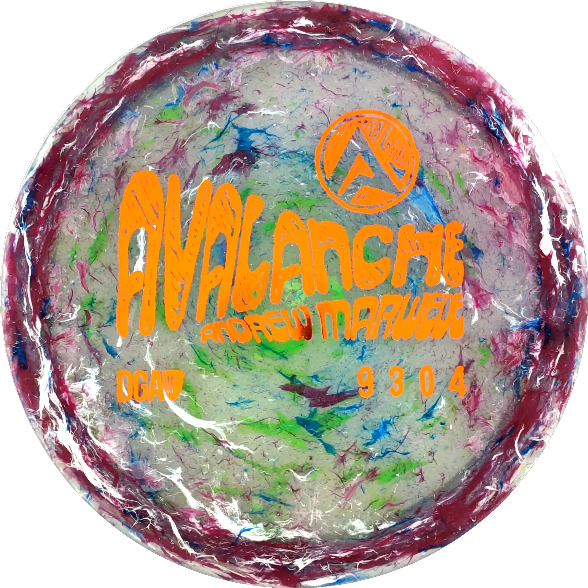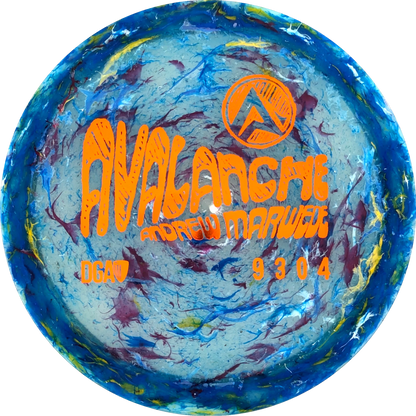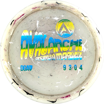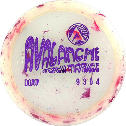 The Avalanche is an ultra-stable fairway driver, built for sure-footed lines, controlled throws in the wind and powerful drives. This version of the Avalanche is part of the DGA 2025 Tour Series for Andrew Marwede and is made from the new Granite plastic, which combines colorful marble patterns with a perfect balance of grip and flexibility. With low glide and a pronounced fade, the Avalanche provides security on both drives and approaches. An obvious choice for players looking for maximum stability and control.