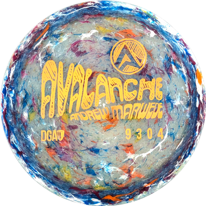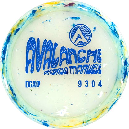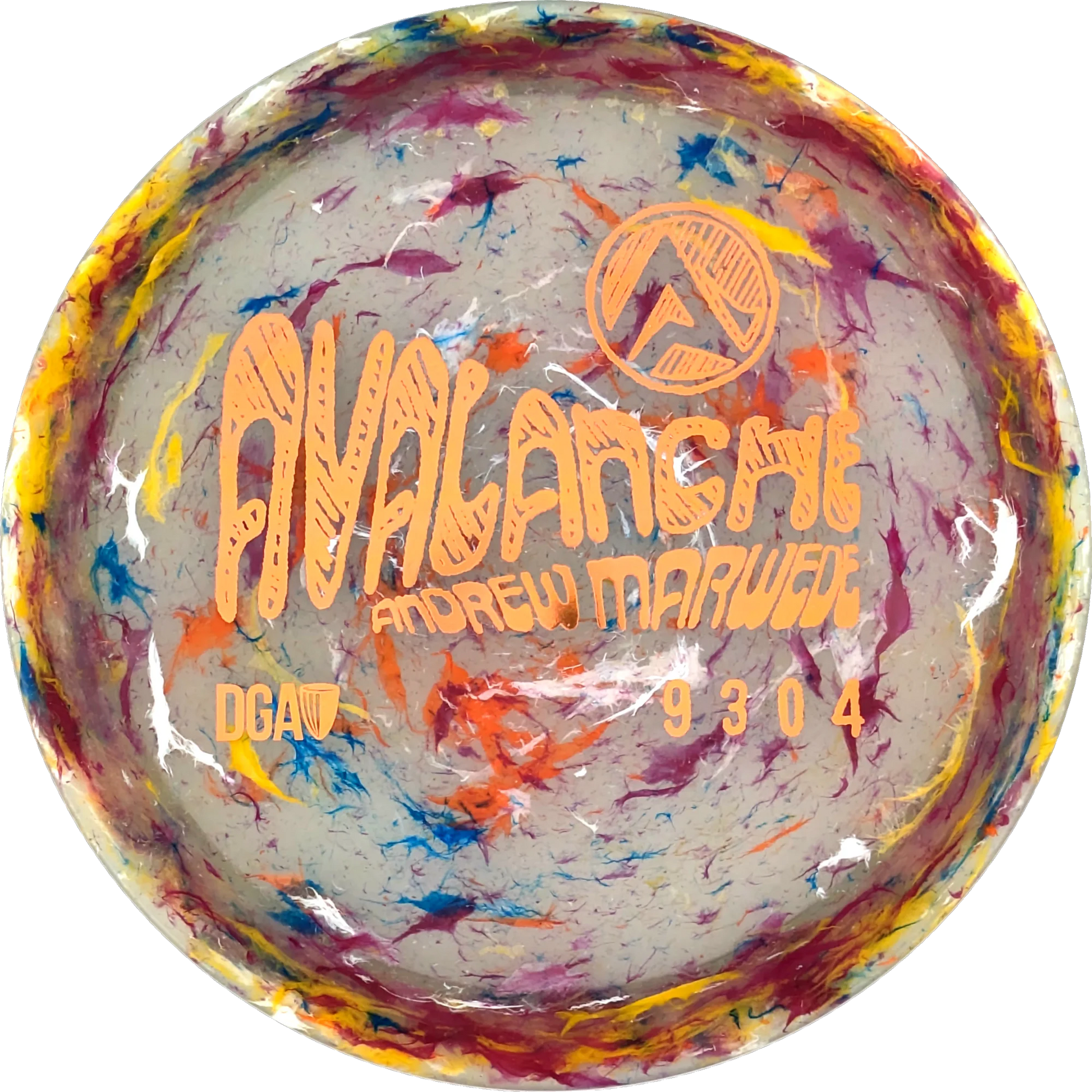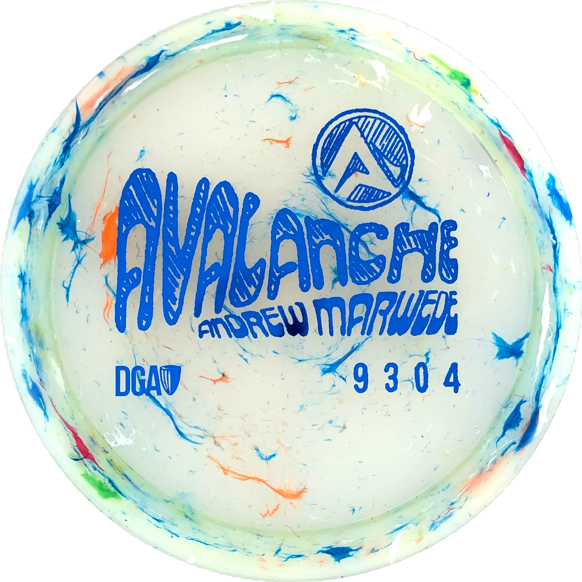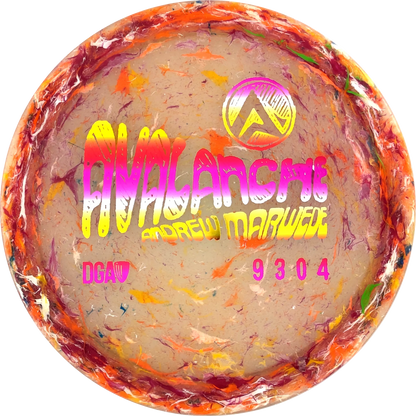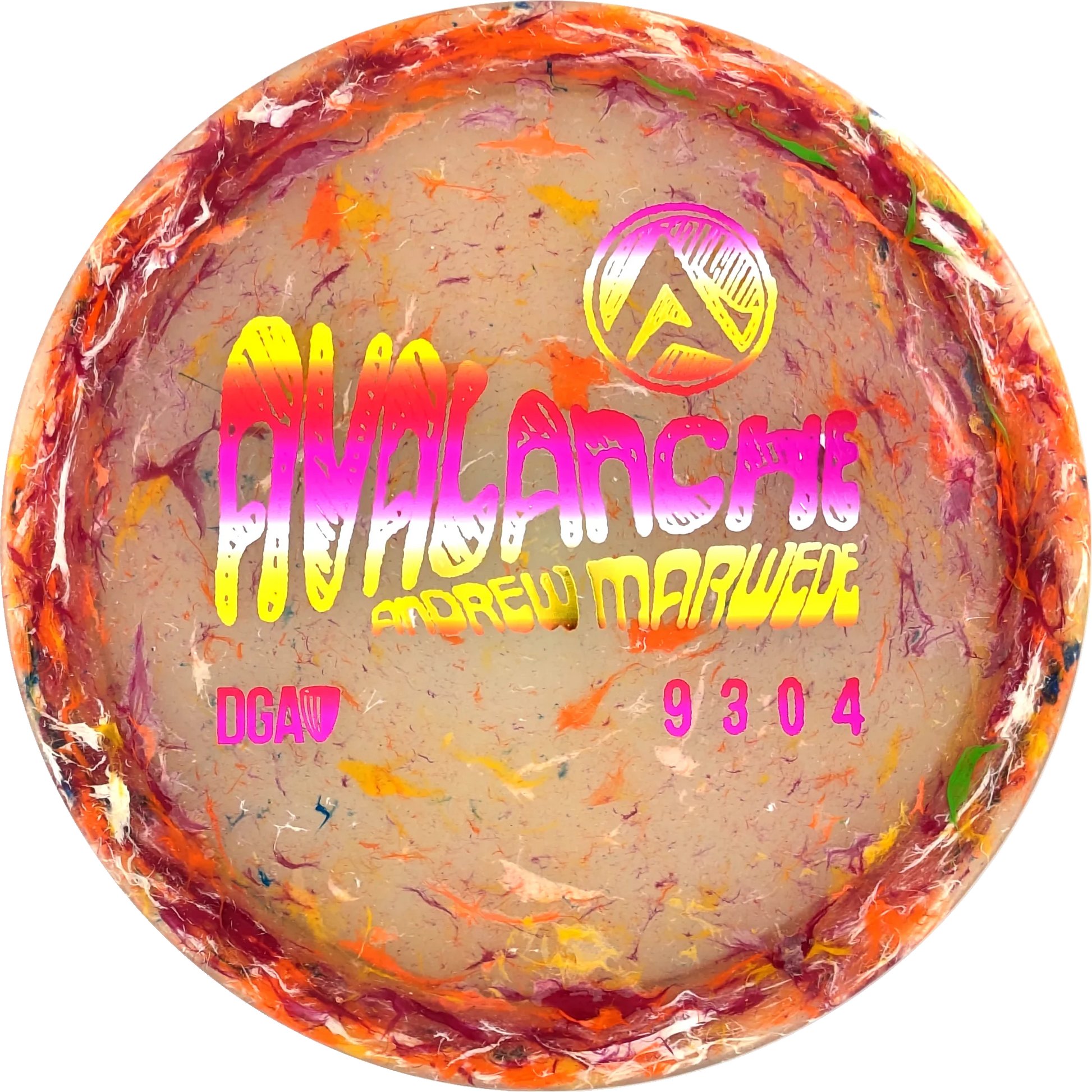The Avalanche is an ultra-stable fairway driver, built for sure-footed lines, controlled throws in the wind and powerful drives. This version of the Avalanche is part of the DGA 2025 Tour Series for Andrew Marwede and is made from the new Granite plastic, which combines colorful marble patterns with a perfect balance of grip and flexibility. With low glide and a pronounced fade, the Avalanche provides security on both drives and approaches. An obvious choice for players looking for maximum stability and control.