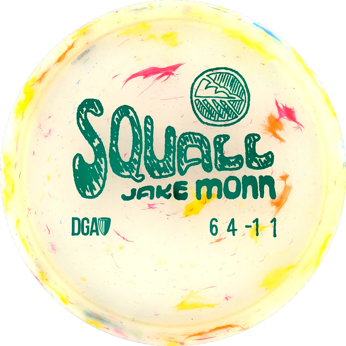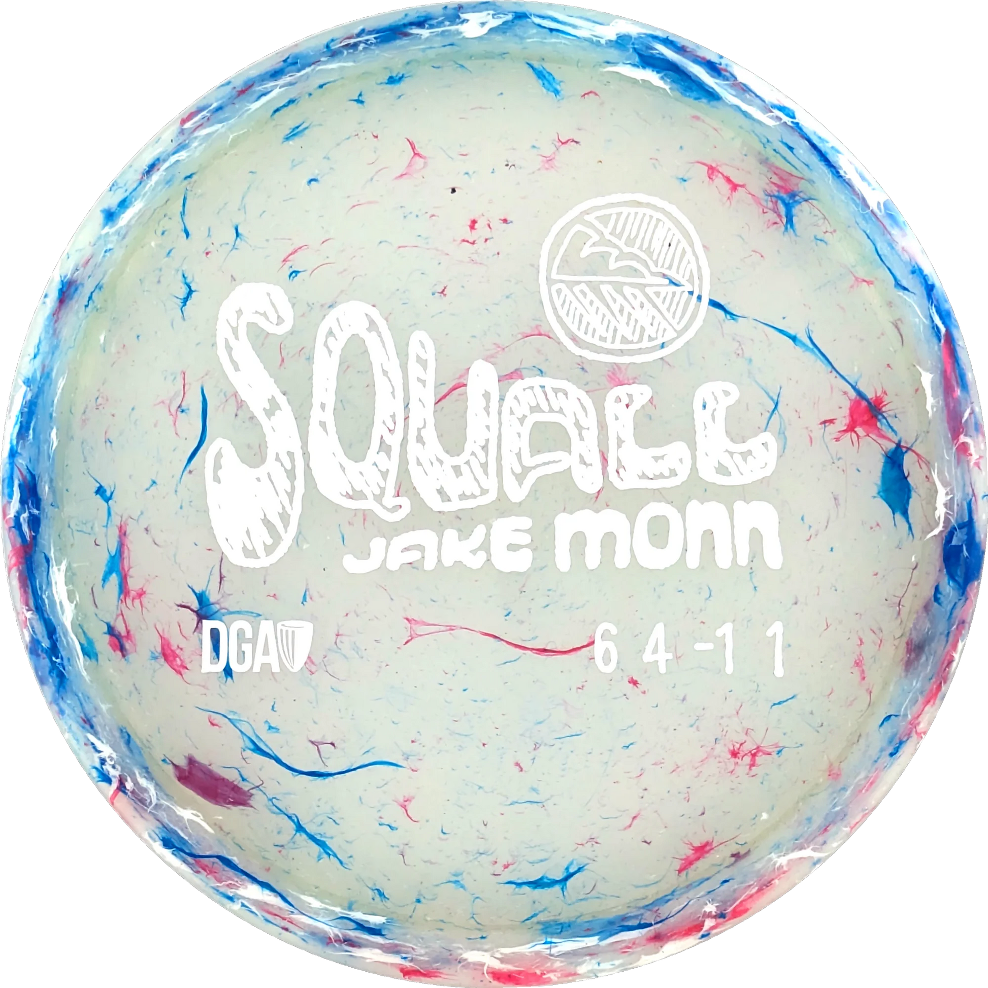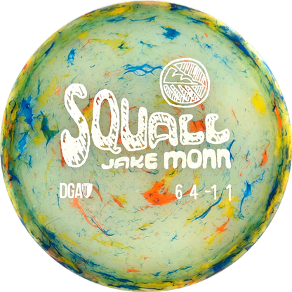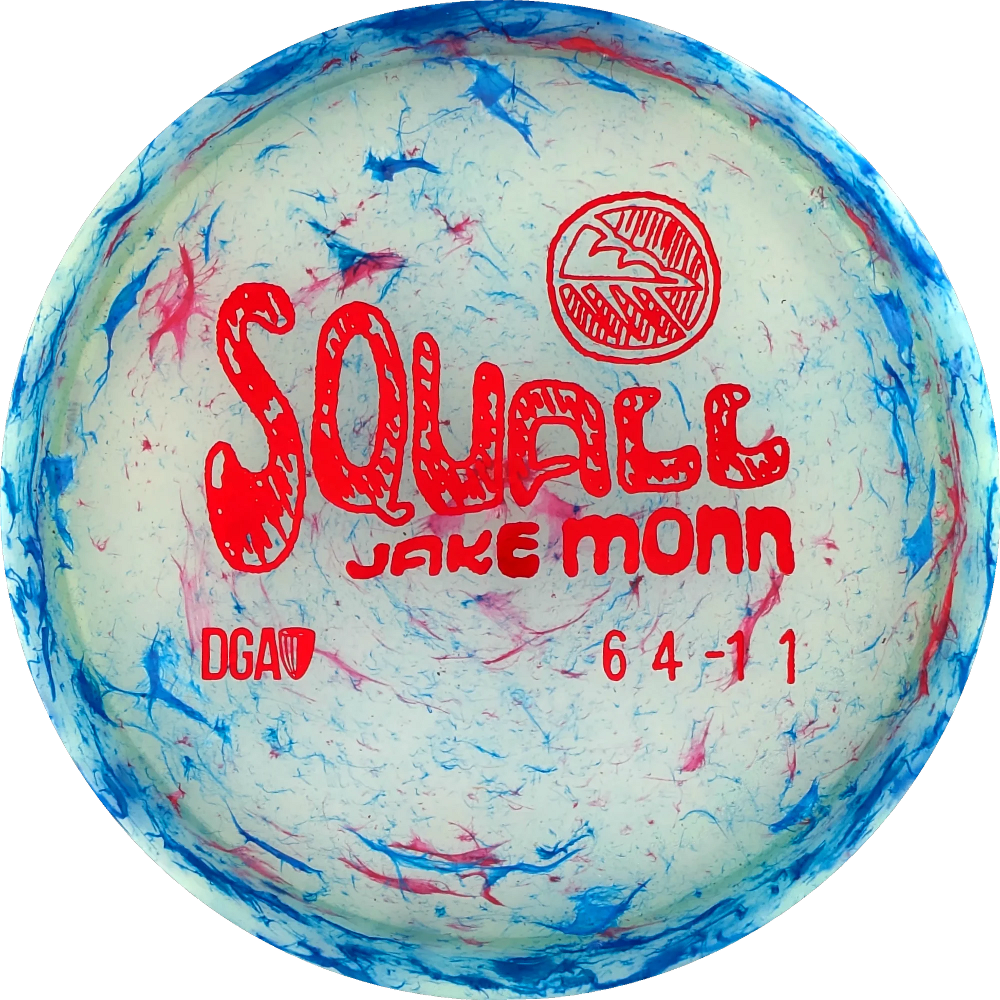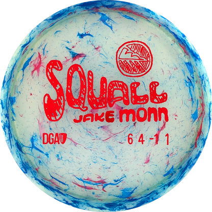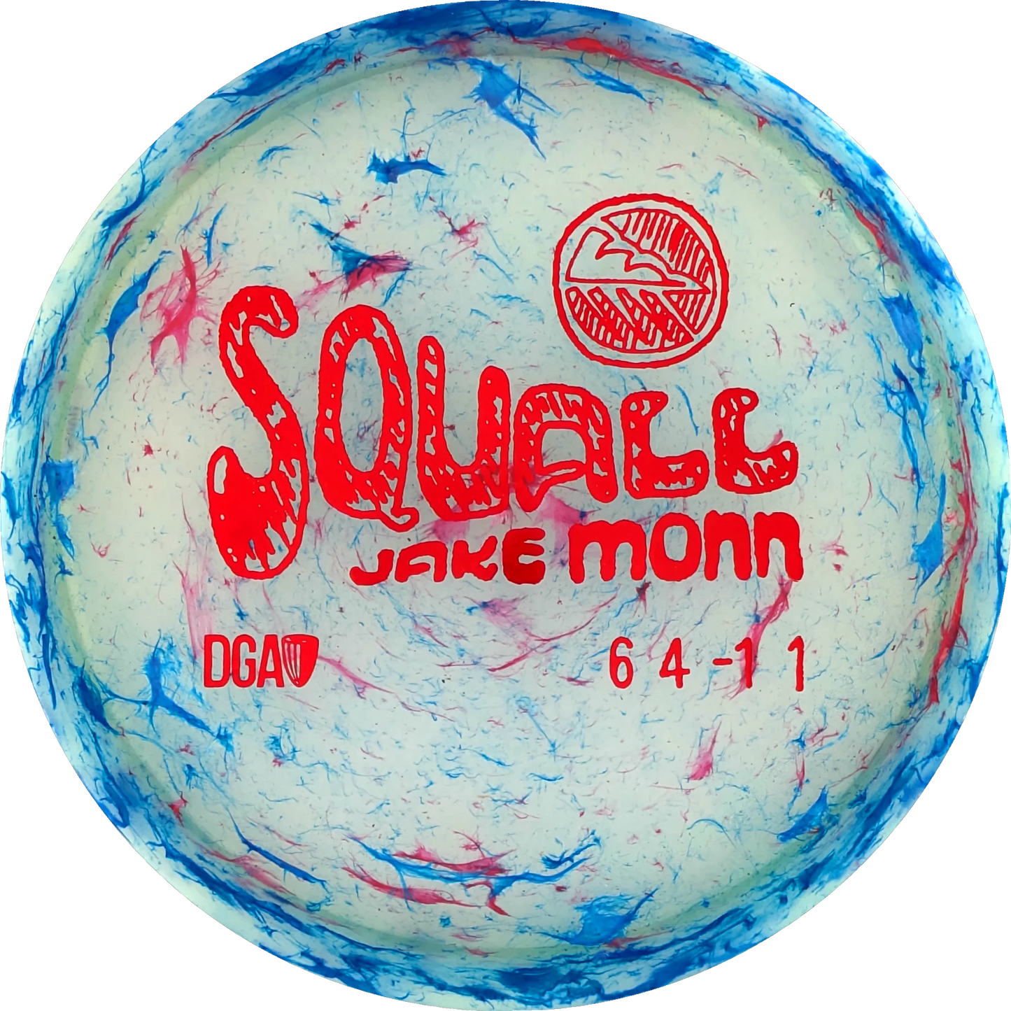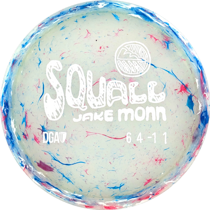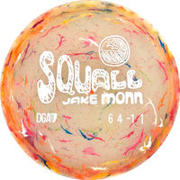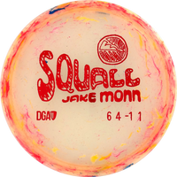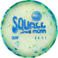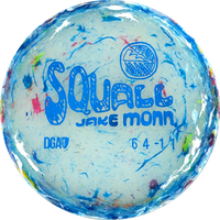 Squall is a versatile midrange with high glide and a slightly understable flight curve that allows for straight throws with controlled fade. This version of Squall is part of the DGA 2025 Tour Series and selected by Jake Monn. Made from DGA's Granite plastic, which ensures a good grip and gives each disc a unique marbled look. Squall is suitable for both long approaches and short drives, where precision and versatility are the keywords. A stable midrange for a wide range of throw types.