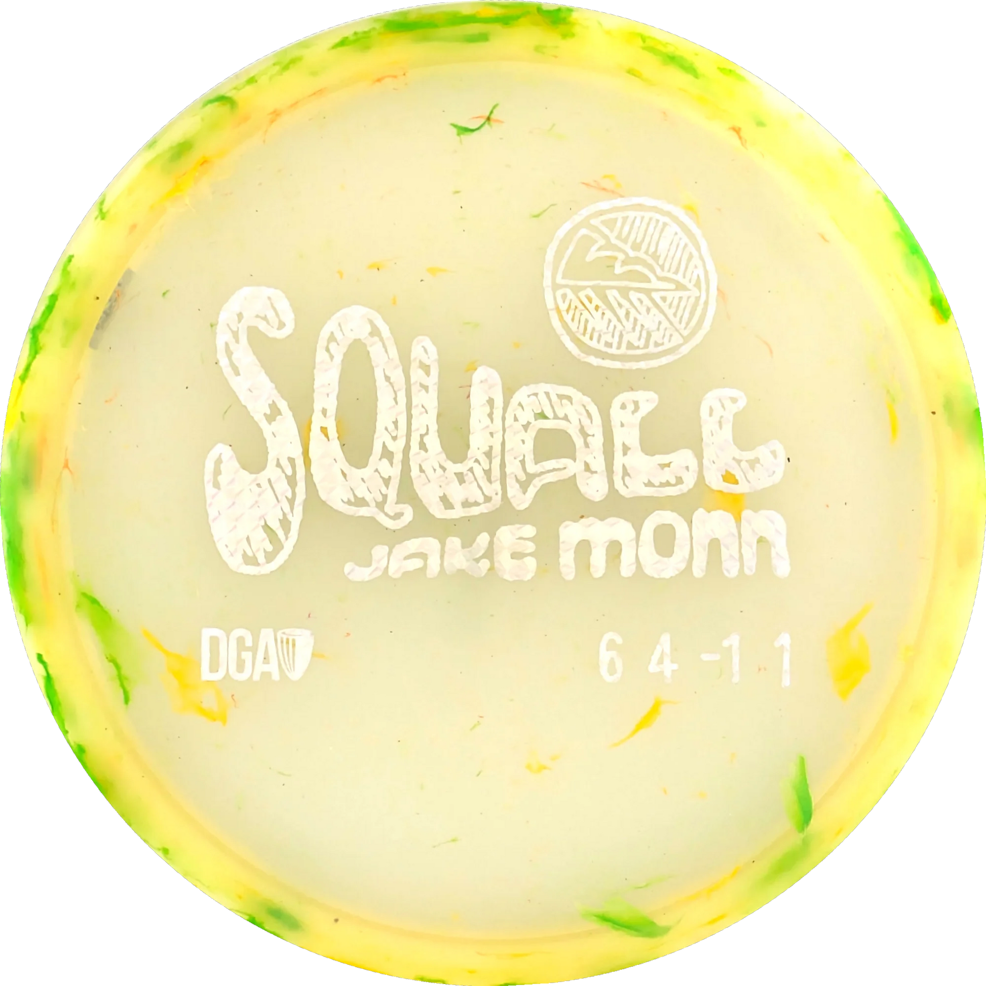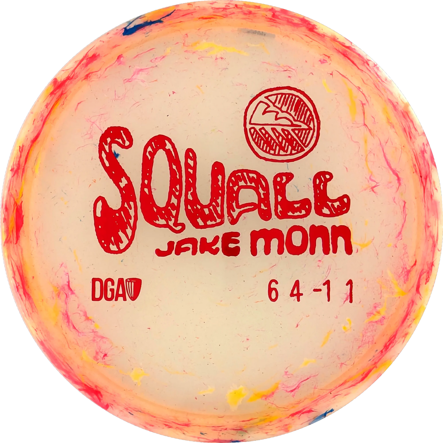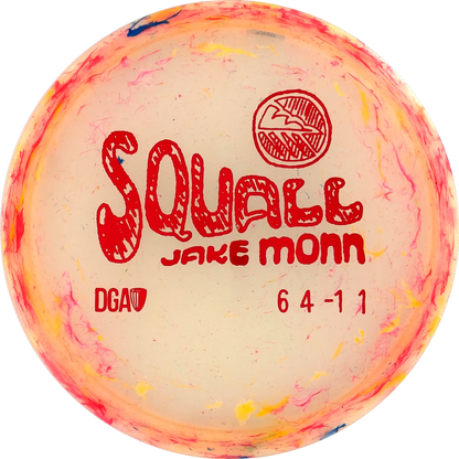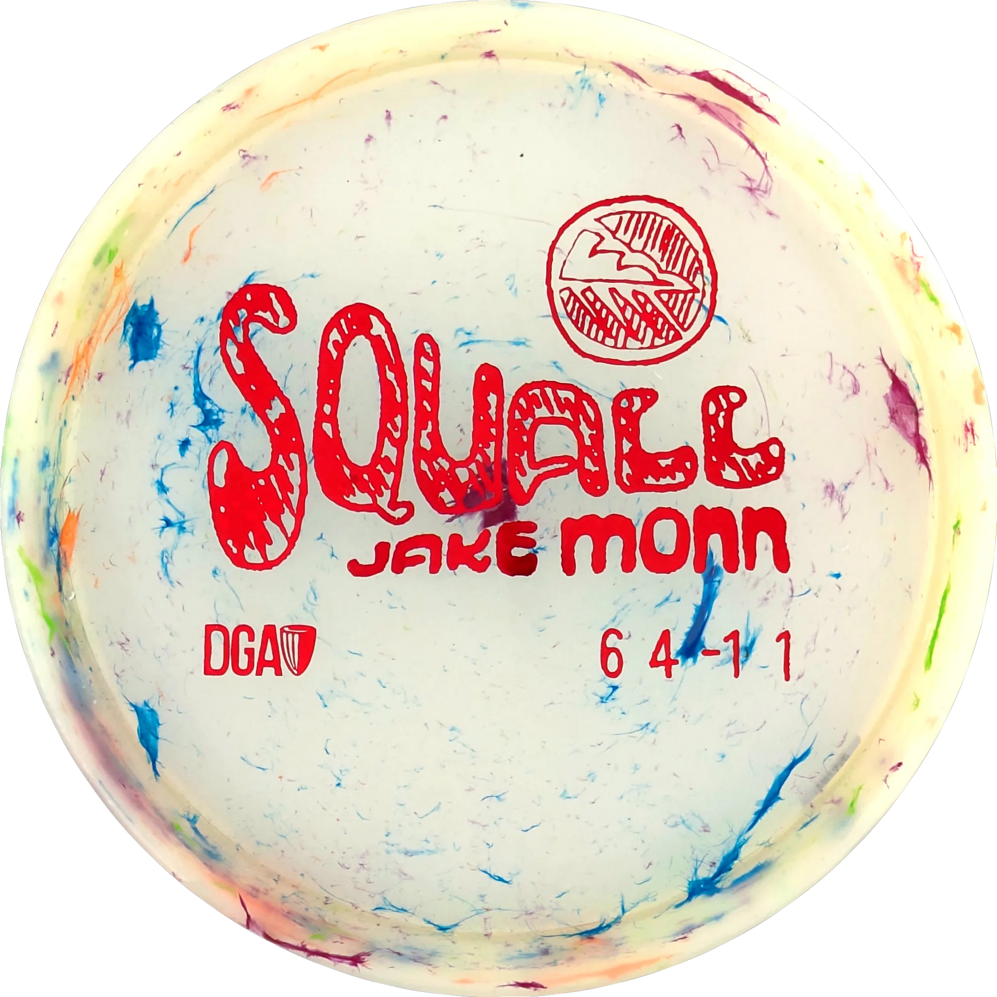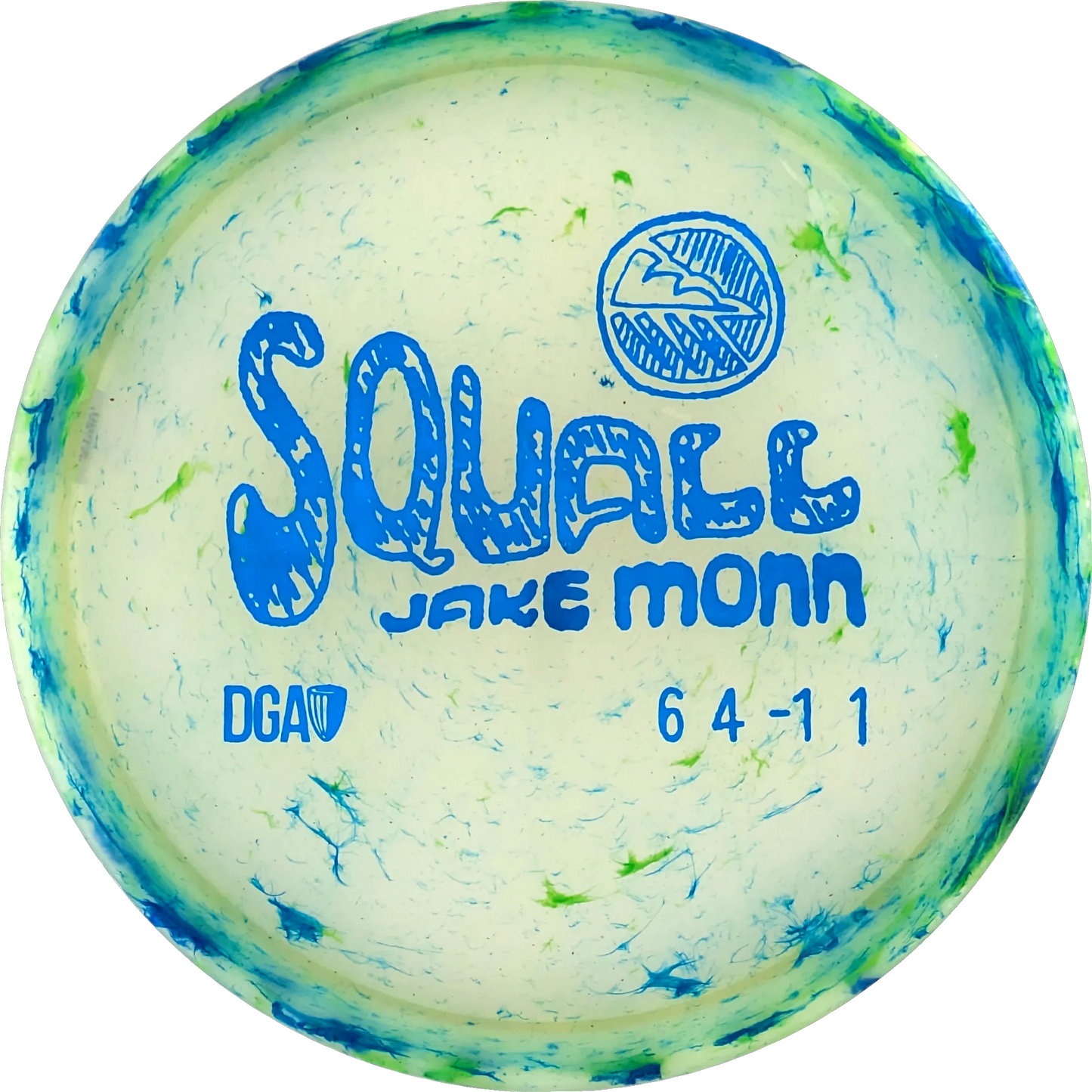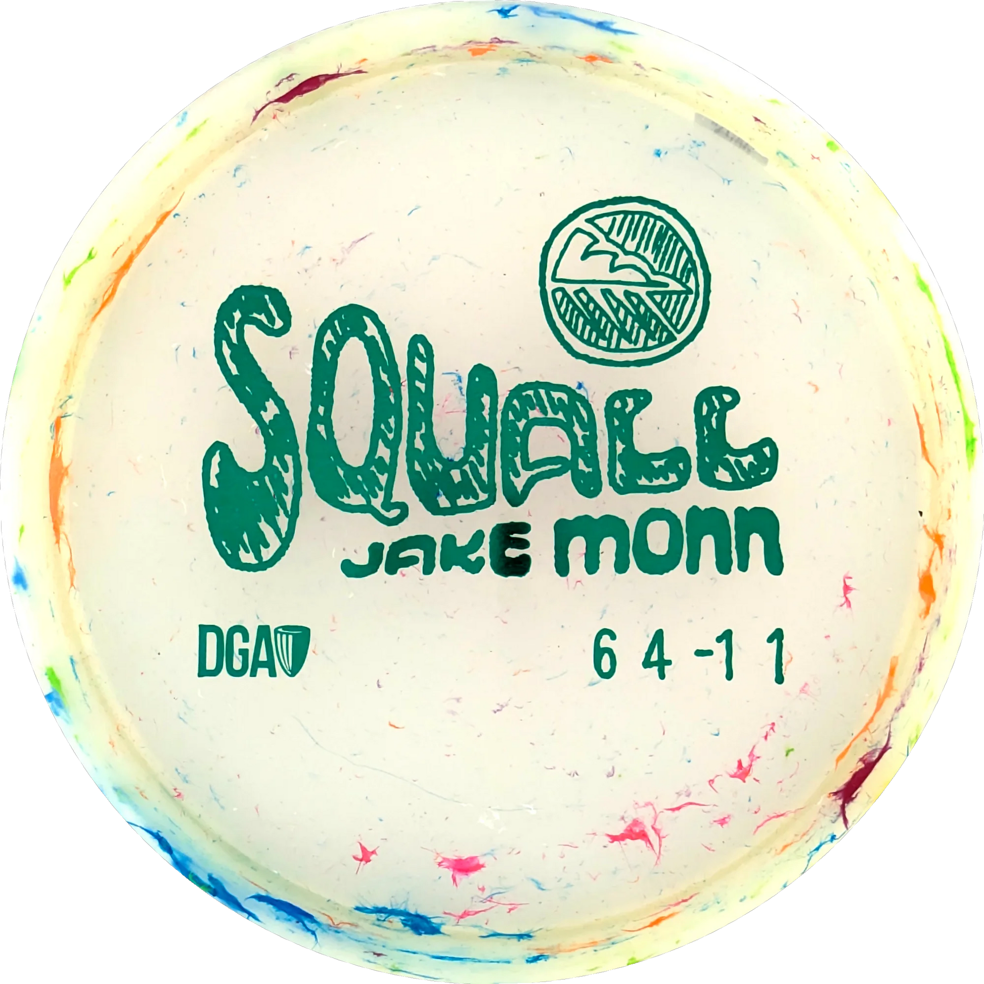 Squall is a versatile midrange with high glide and a slightly understable flight curve that allows for straight throws with controlled fade. This version of Squall is part of the DGA 2025 Tour Series and selected by Jake Monn. Made from DGA's Granite plastic, which ensures a good grip and gives each disc a unique marbled look. Squall is suitable for both long approaches and short drives, where precision and versatility are the keywords. A stable midrange for a wide range of throw types.