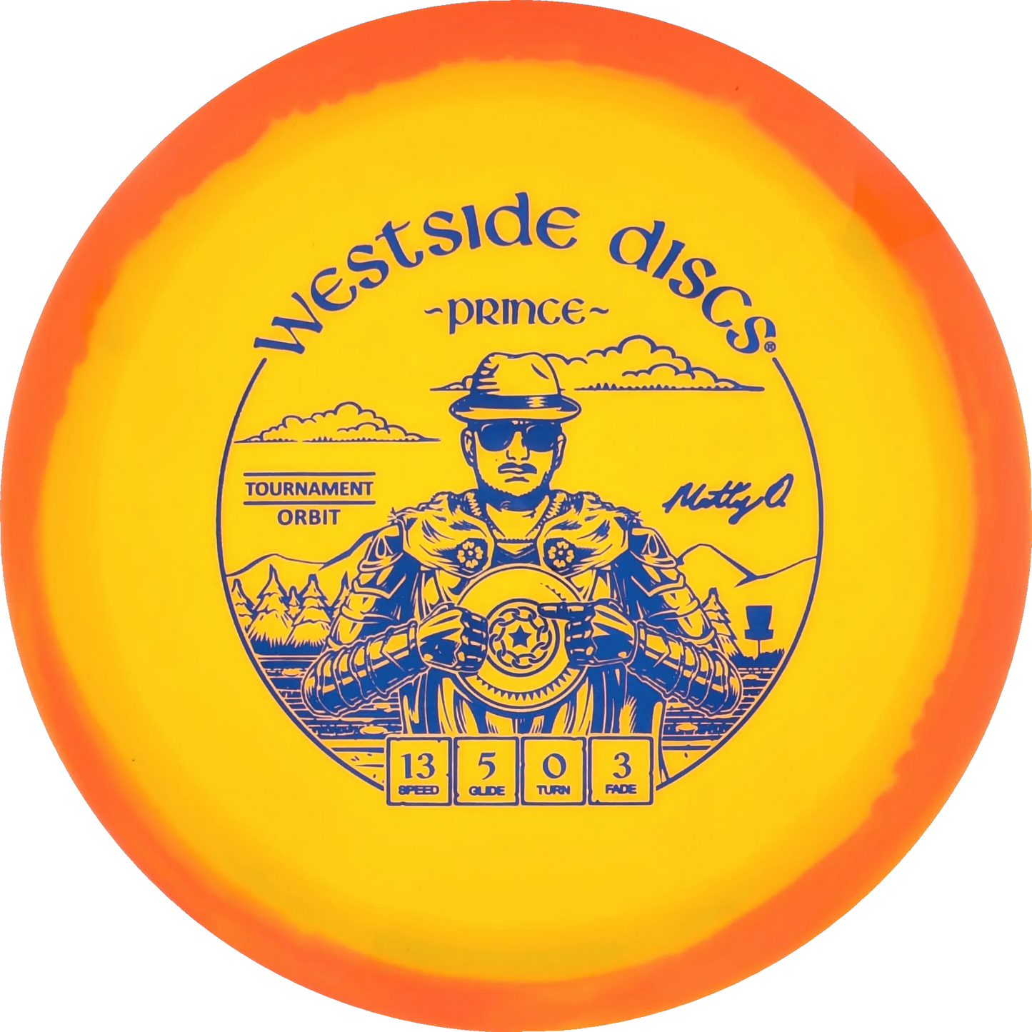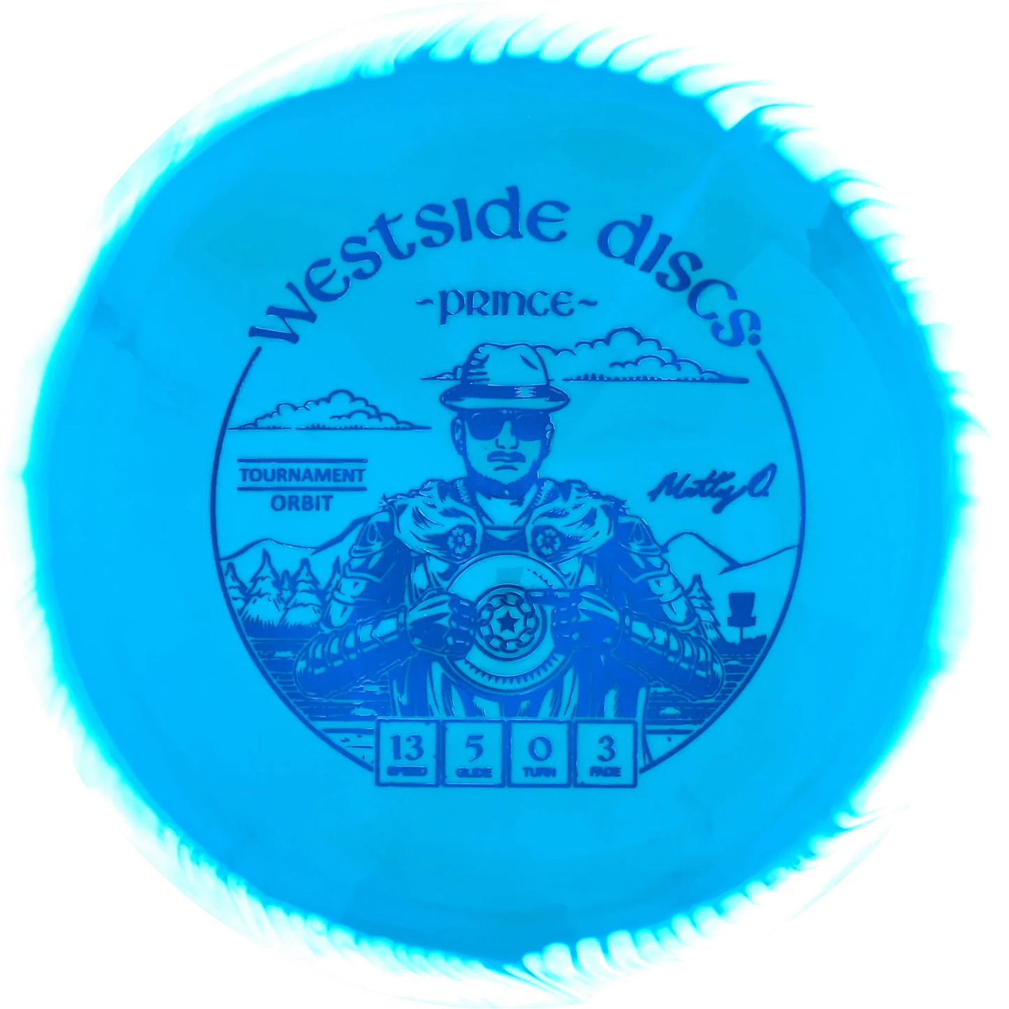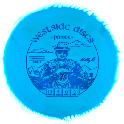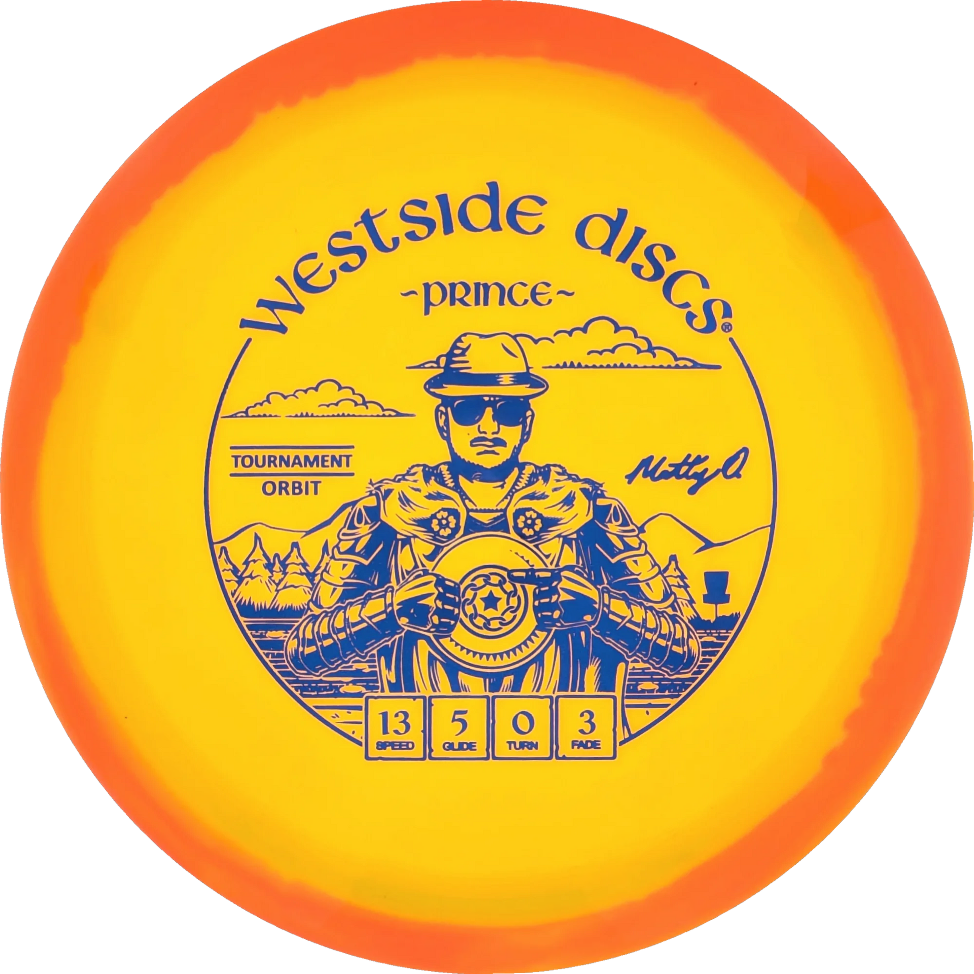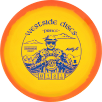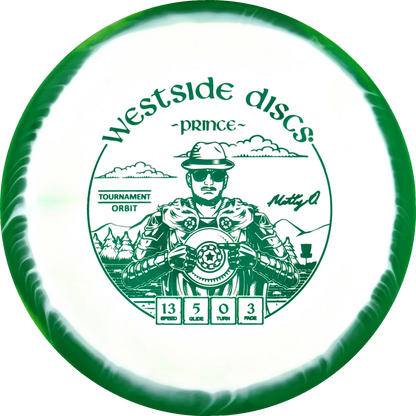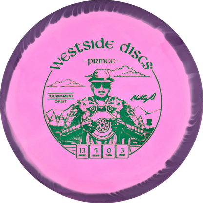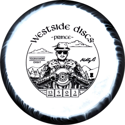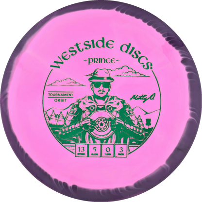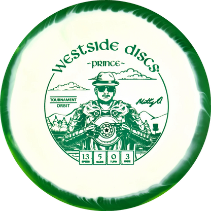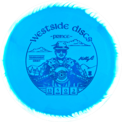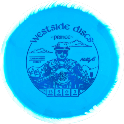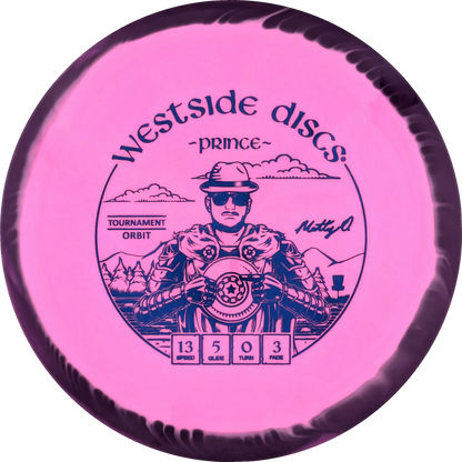 The Prince from Westside Discs is an overstable driver designed for long throws at full speed. It is a disc you can rely on, even in windy conditions. Here it is released in a 2025 Team Series for Matt Orum in the beautiful Tournament Orbit plastic.