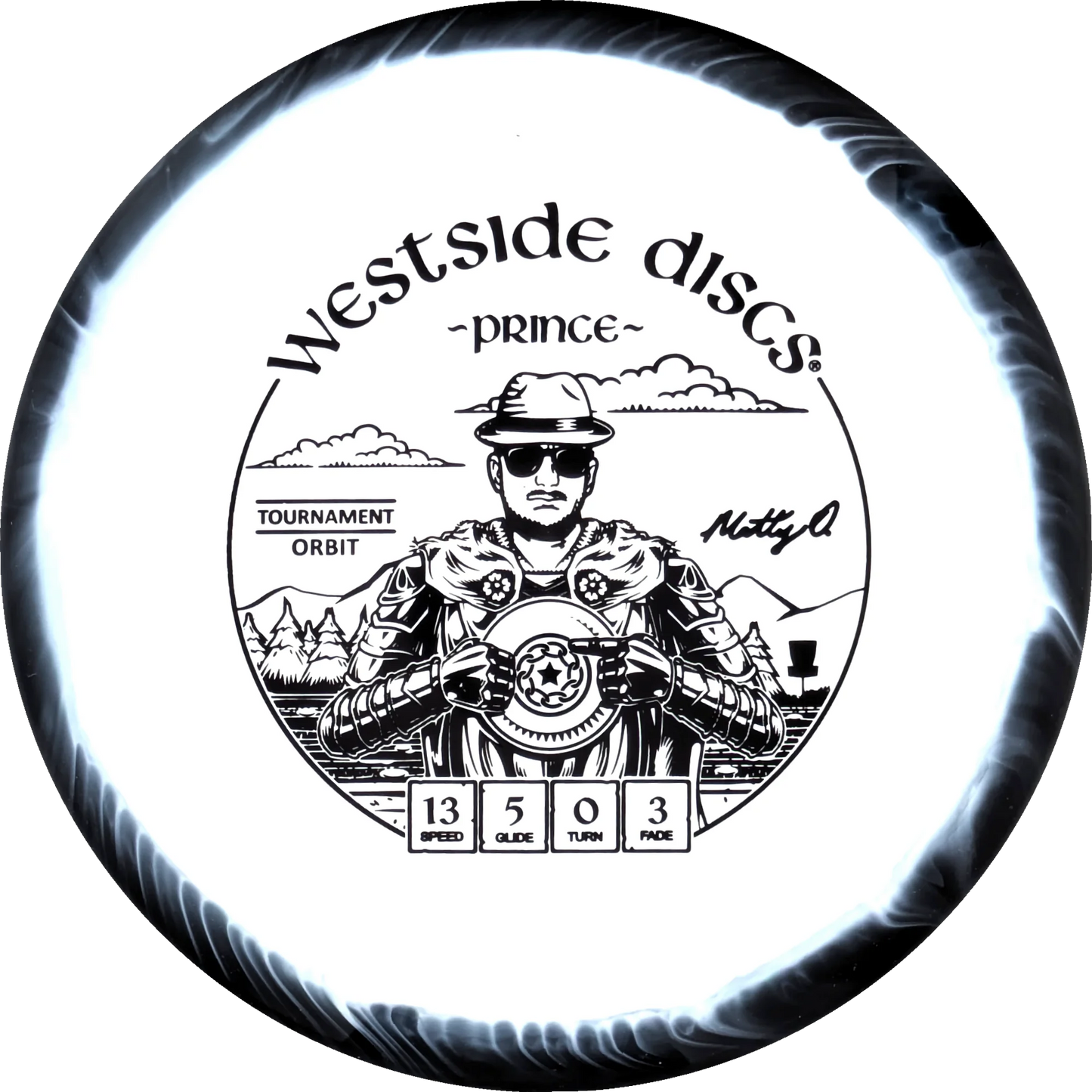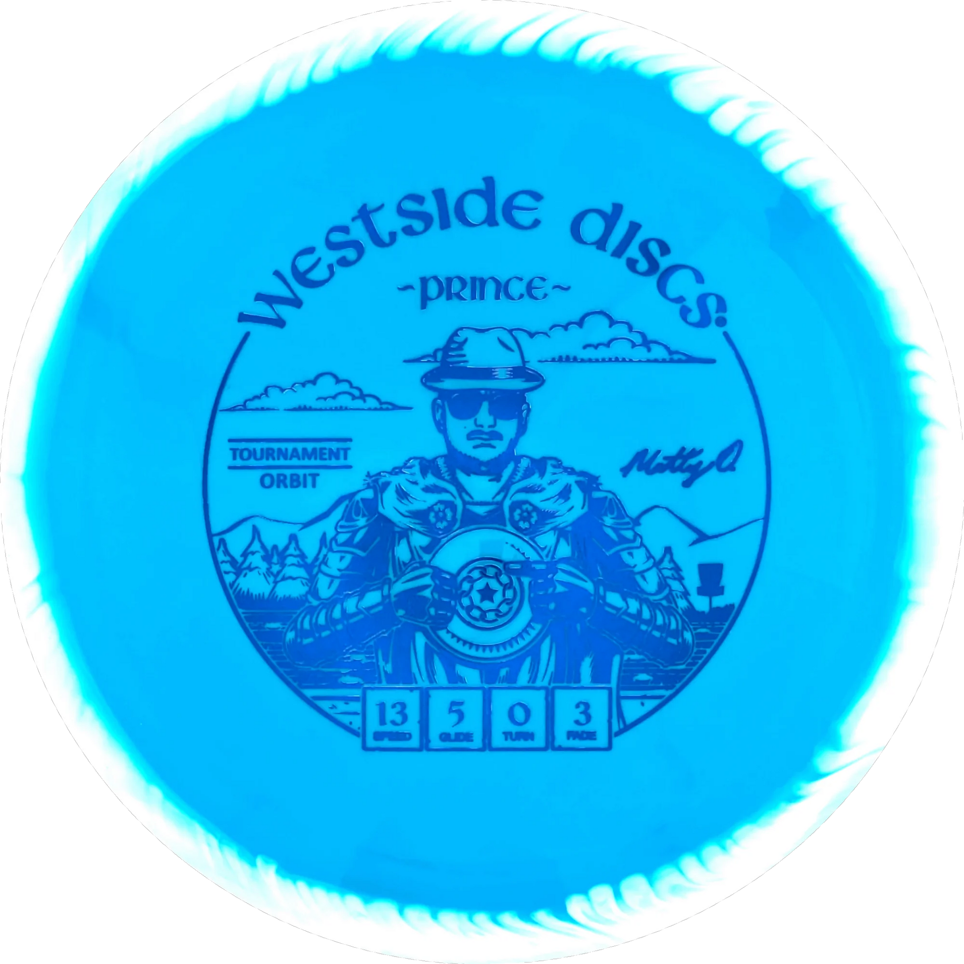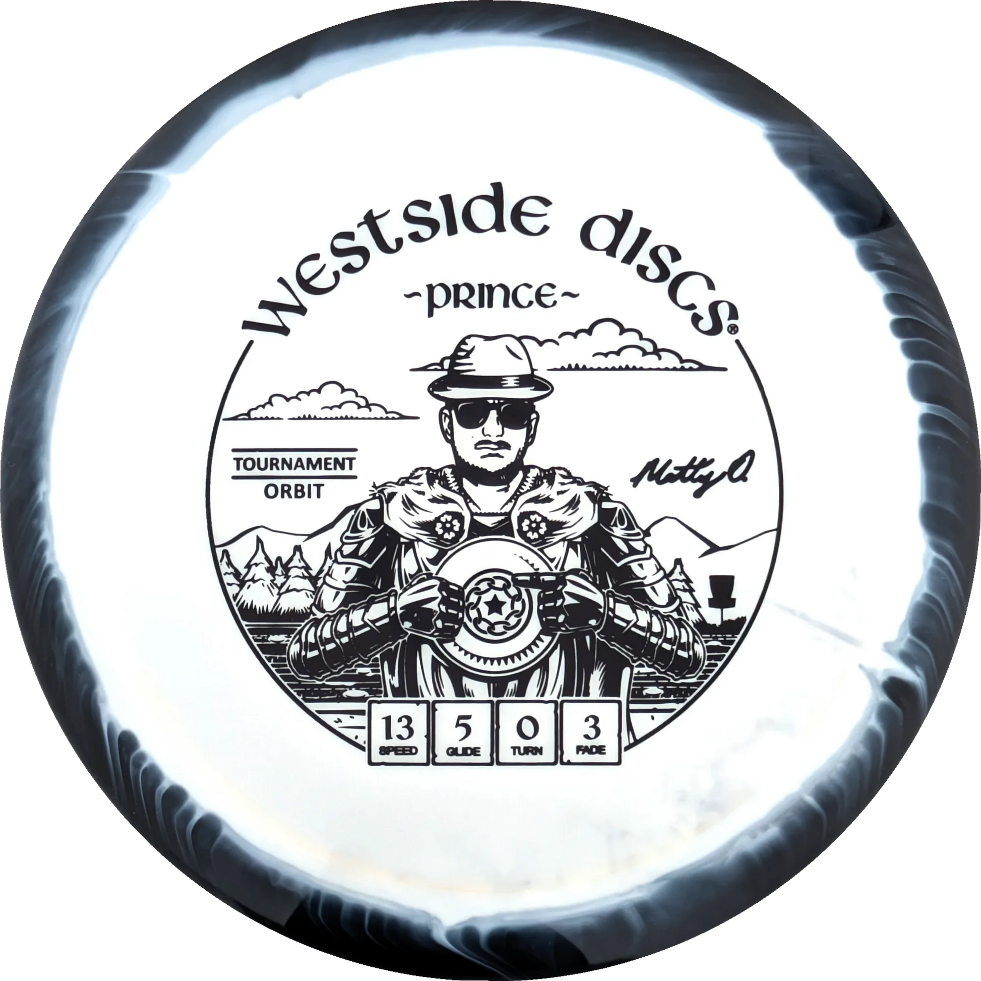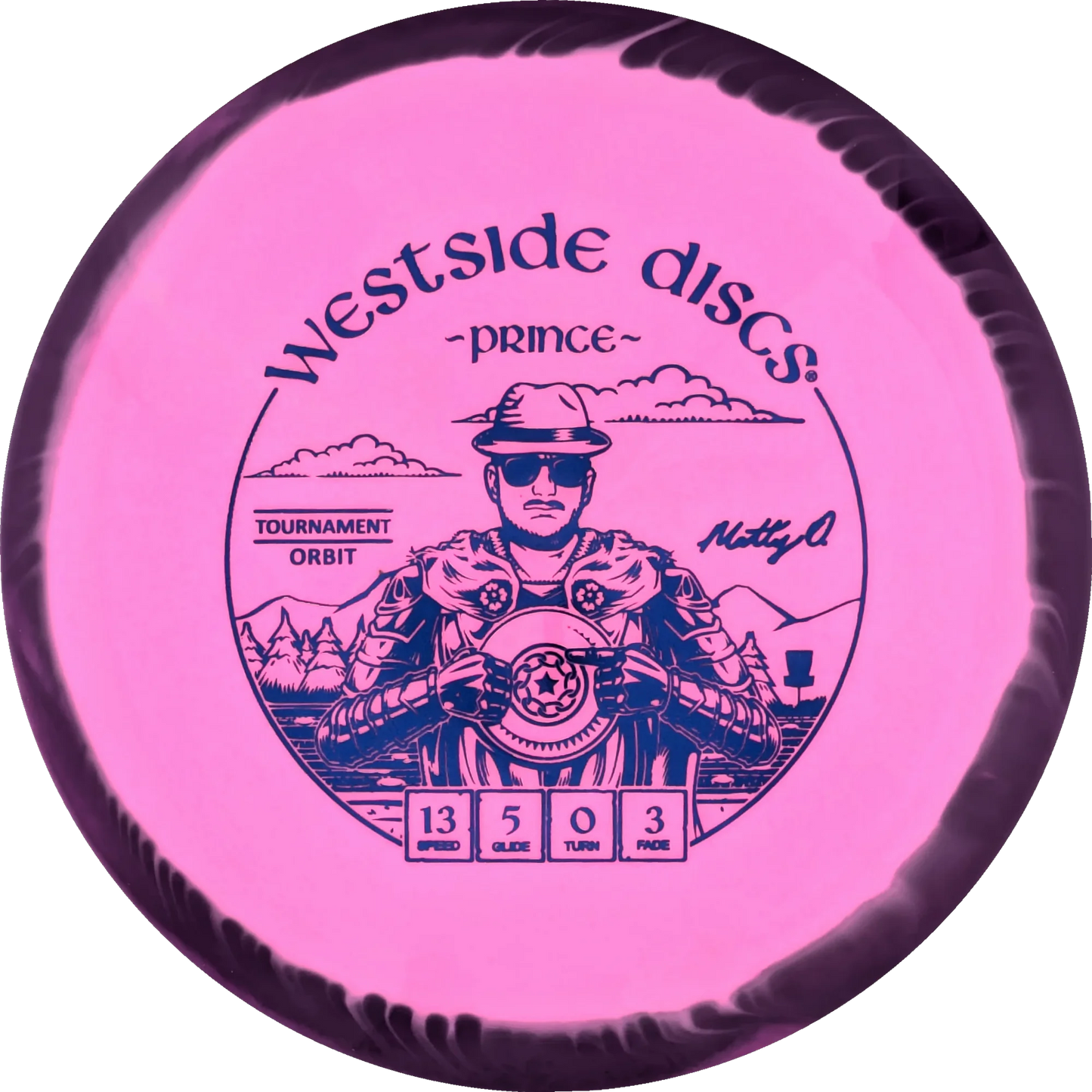 The Prince from Westside Discs is an overstable driver designed for long throws at full speed. It is a disc you can rely on, even in windy conditions. Here it is released in a 2025 Team Series for Matt Orum in the beautiful Tournament Orbit plastic.