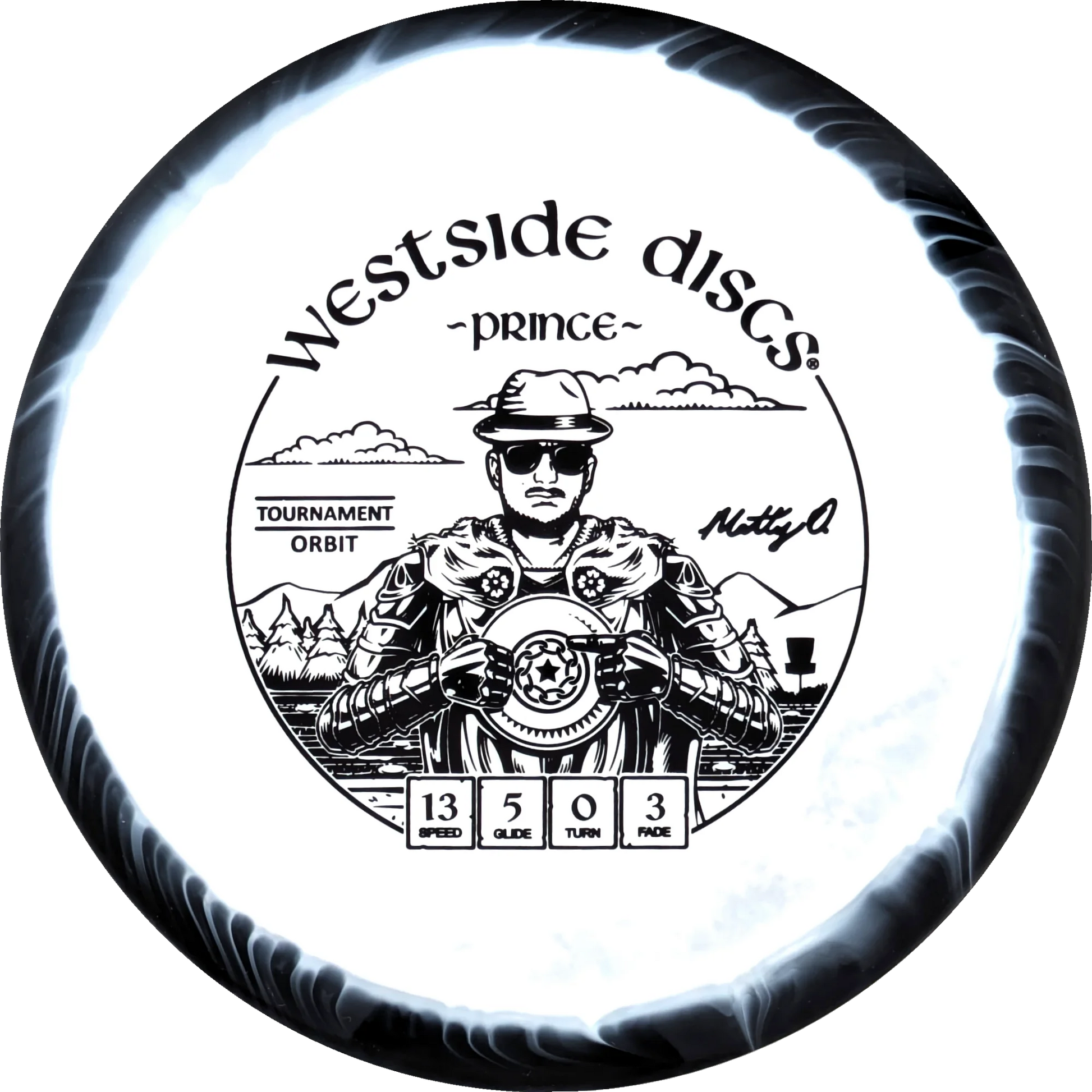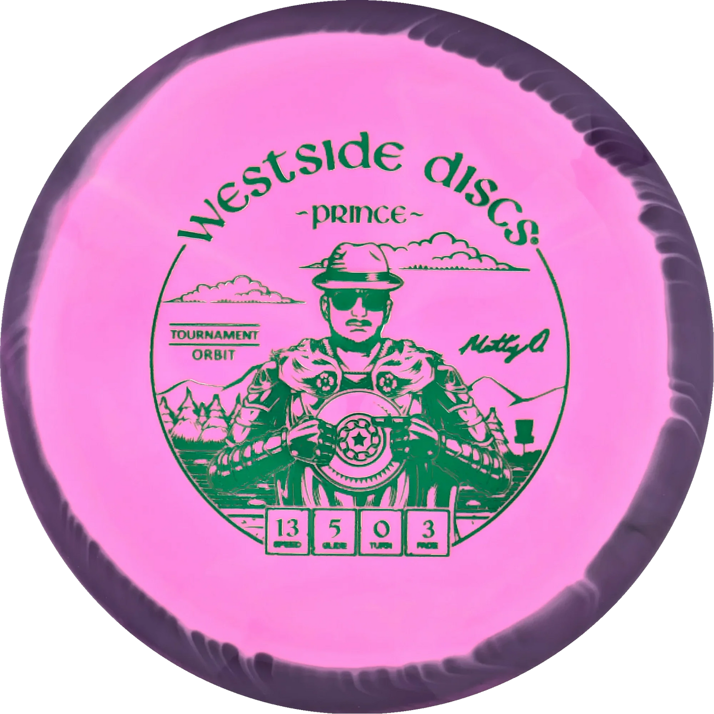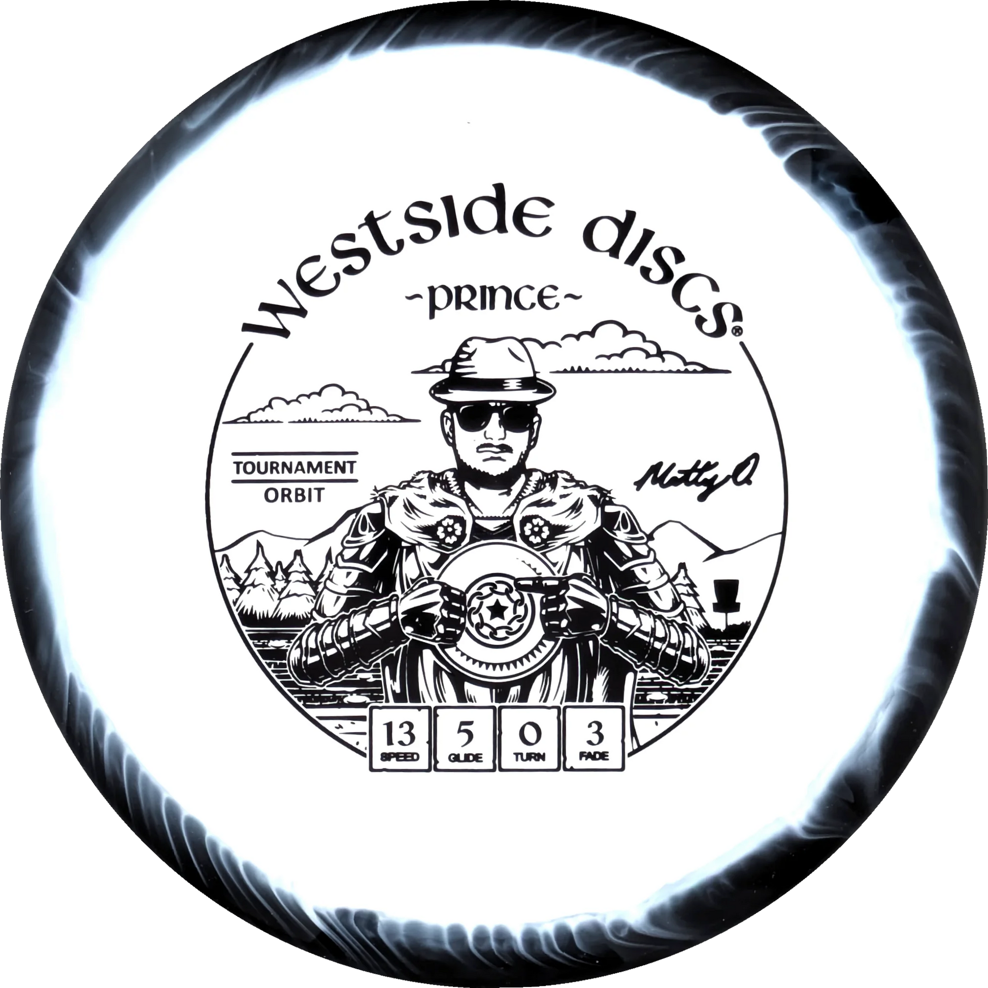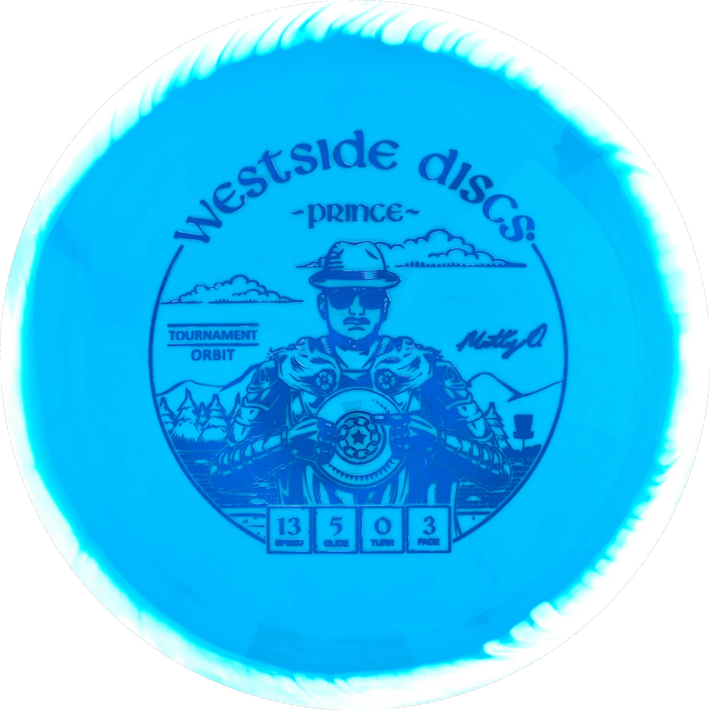 The Prince from Westside Discs is an overstable driver designed for long throws at full speed. It is a disc you can rely on, even in windy conditions. Here it is released in a 2025 Team Series for Matt Orum in the beautiful Tournament Orbit plastic.