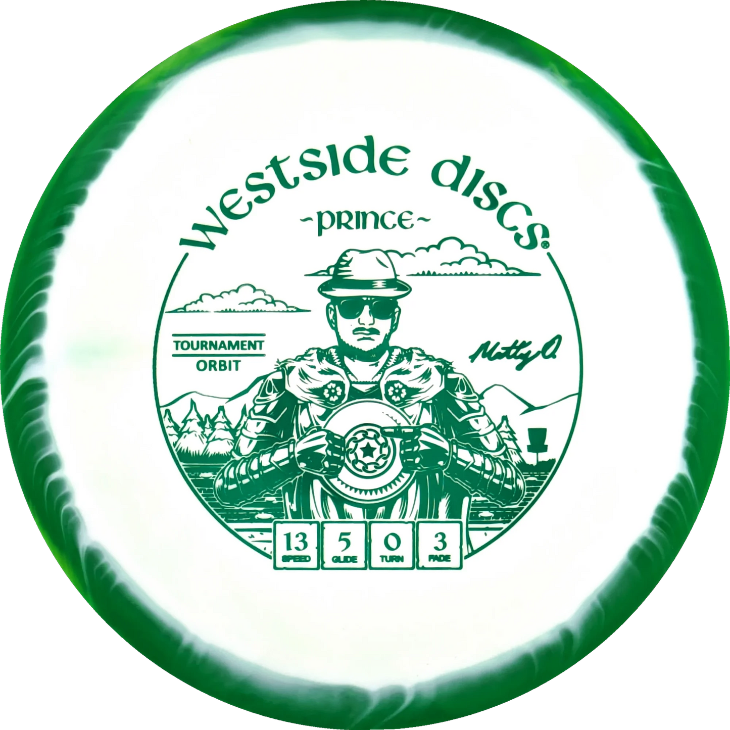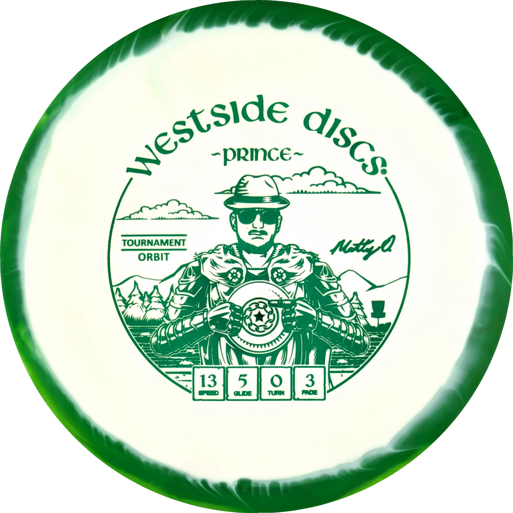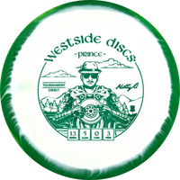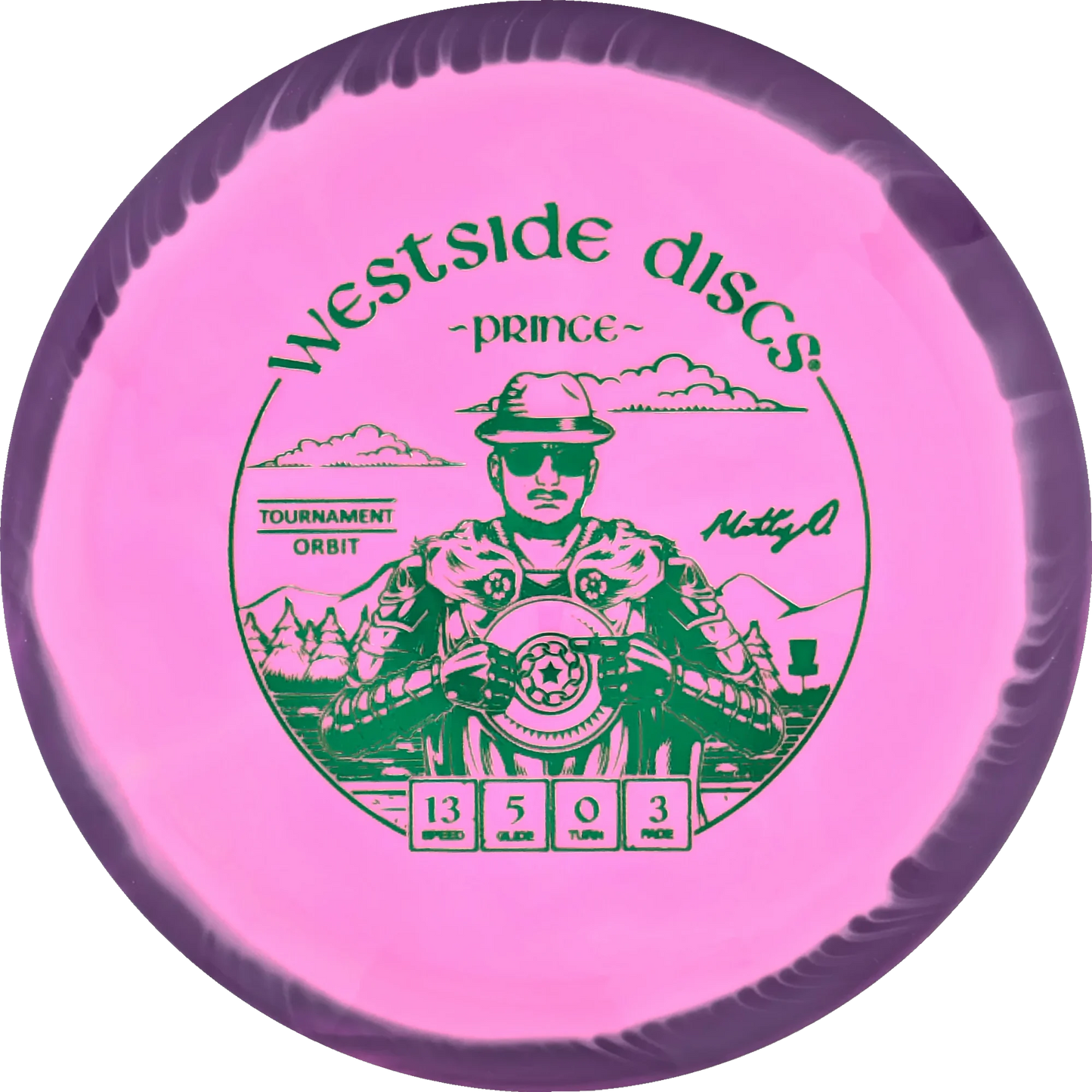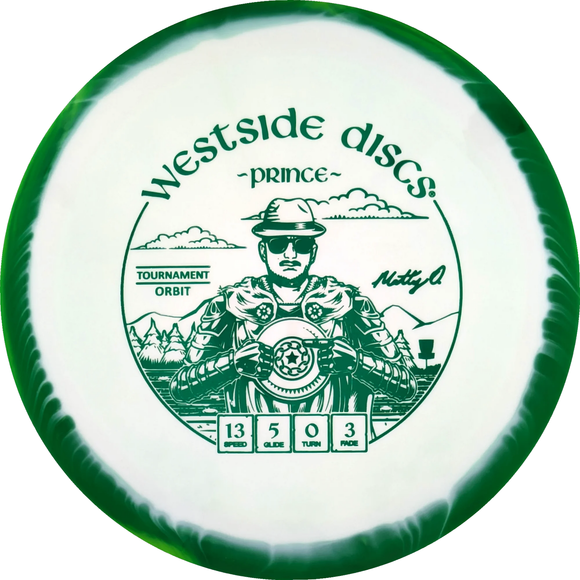 The Prince from Westside Discs is an overstable driver designed for long throws at full speed. It is a disc you can rely on, even in windy conditions. Here it is released in a 2025 Team Series for Matt Orum in the beautiful Tournament Orbit plastic.